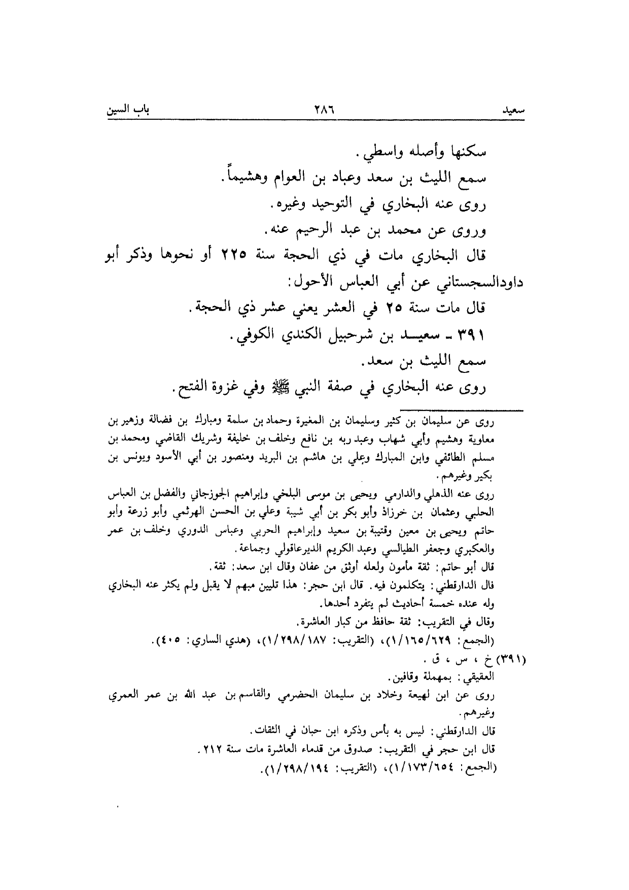391 - سعيد بن شُرَحْبِيل الْكِنْدِيّ الْكُوفِي سمع اللَّيْث بن سعد رَوَى عَنهُ البُخَارِيّ فِي صفة النَّبِي صَلَّى الله عَلَيْهِ وَسلم وَفِي غَزْوَة الْفَتْح