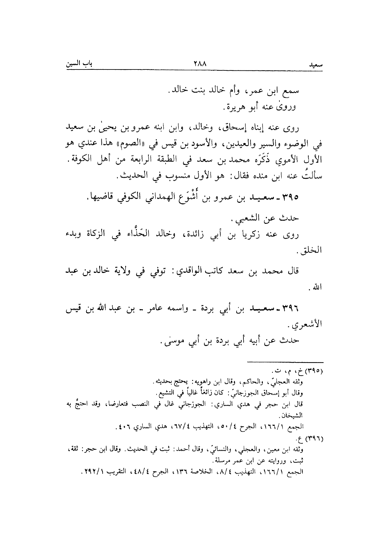 395 - سعيد بن عَمْرو بن أَشوع الْهَمدَانِي الْكُوفِي قاضيها حدث عَن الشّعبِيّ رَوَى عَنهُ زَكَرِيَّا بن أبي زَائِدَة وخَالِد الْحذاء فِي الزَّكَاة وبدء الْخلق قَالَ مُحَمَّد بن سعد كَاتب الْوَاقِدِيّ توفّي فِي ولَايَة خَالِد بن عبد الله