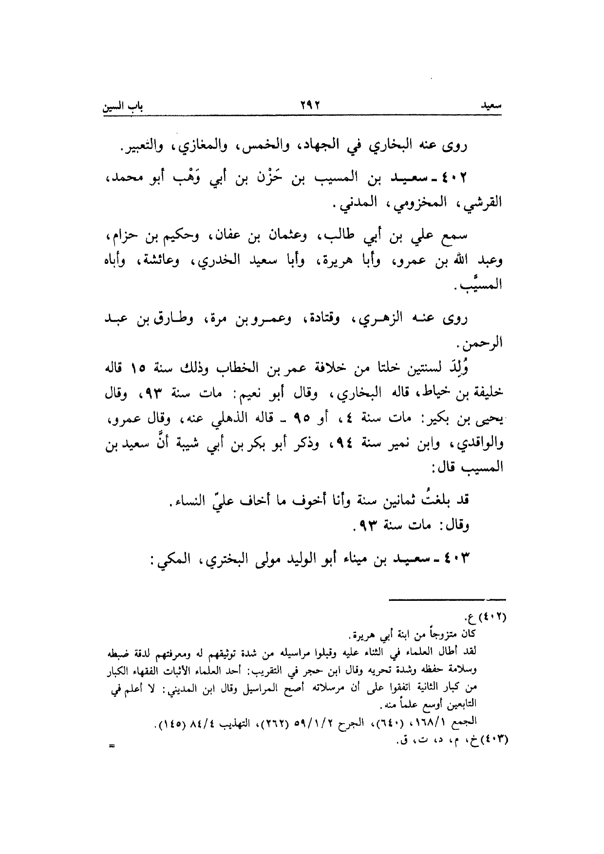 402 - سعيد بن الْمسيب بن حزن بن أبي وهب أَبُو مُحَمَّد الْقرشِي المَخْزُومِي الْمدنِي سمع عَلّي بن أبي طَالب وَعُثْمَان بن عَفَّان وَحَكِيم بن حزَام وَعبد الله بن عَمْرو وَأَبا هُرَيْرَة وَأَبا سعيد الْخُدْرِيّ وَعَائِشَة وأباه الْمسيب رَوَى عَنهُ عَنهُ الزُّهْرِيّ وَقَتَادَة وَعَمْرو بن مرّة وطارق بن عبد الرَّحْمَن ولد لِسنتَيْنِ خلتا من خلَافَة عمر بن الْخطاب وَذَلِكَ سنة 15 قَالَه خَليفَة بن خياط قَالَه البُخَارِيّ وَقَالَ أَبُو نعيم مَاتَ سنة 93 وَقَالَ يَحْيَى بن بكير مَاتَ سنة 4 أَو 95 قَالَه الذهلي عَنهُ وَقَالَ عَمْرو والواقدي وَابْن نمير سنة 94 وَذكر أَبُو بكر بن أبي شيبَة أَن سعيد بن الْمسيب قَالَ قد بلغت ثَمَانِينَ سنة وَأَنا أخوف مَا أَخَاف عَلّي النِّسَاء وَقَالَ مَاتَ سنة 93