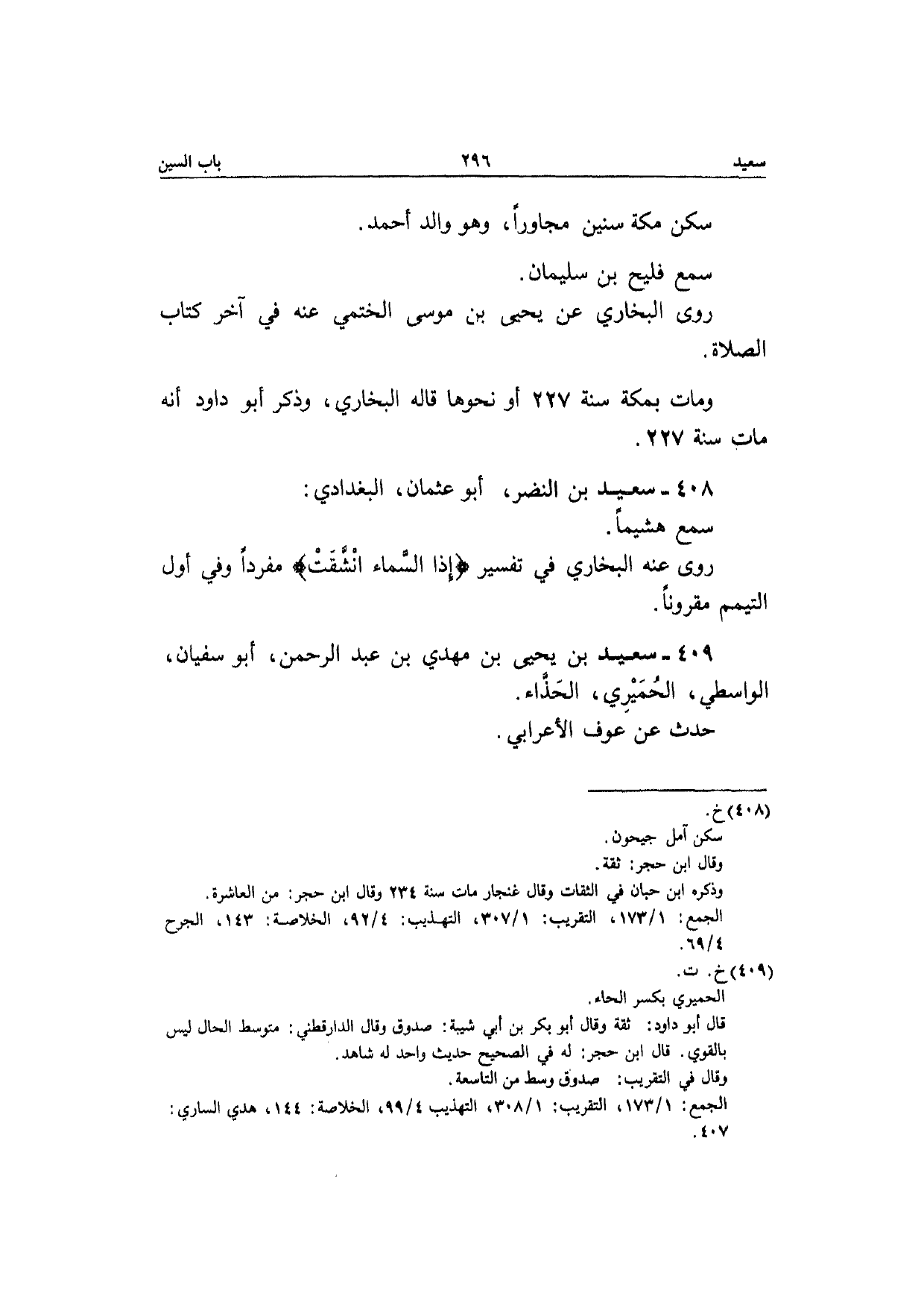 408 - سعيد بن النَّضر أَبُو عُثْمَان الْبَغْدَادِيّ سمع هشيما رَوَى عَنهُ عَنهُ البُخَارِيّ فِي تَفْسِير! إِذا السَّمَاء انشقت! مُفردا وَفِي أول التَّيَمُّم مَقْرُونا