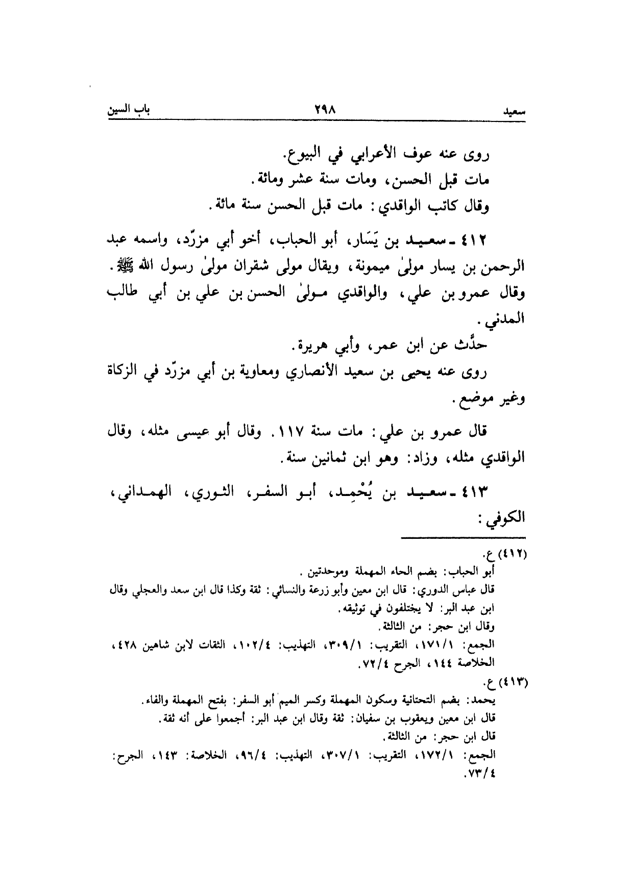 412 - سعيد بن يسَار أَبُو الْحباب أَخُو أبي مزرد واسْمه عبد الرَّحْمَن بن يسَار مولَى مَيْمُونَة وَيُقَال مولَى شقران مولَى رَسُول الله صَلَّى الله عَلَيْهِ وَسلم وَقَالَ عَمْرو بن عَلّي والواقدي مولَى الْحسن بن عَلّي بن أبي طَالب الْمدنِي حدث عَن ابْن عمر وَأبي هُرَيْرَة رَوَى عَنهُ يَحْيَى بن سعيد الْأنْصَارِيّ وَمُعَاوِيَة بن أبي مزرد فِي الزَّكَاة وَغير مَوضِع قَالَ عَمْرو بن عَلّي مَاتَ سنة 117 وَقَالَ أَبُو عِيسَى مثله وَقَالَ الْوَاقِدِيّ مثله وَزَاد وَهُوَ ابْن ثَمَانِينَ سنة