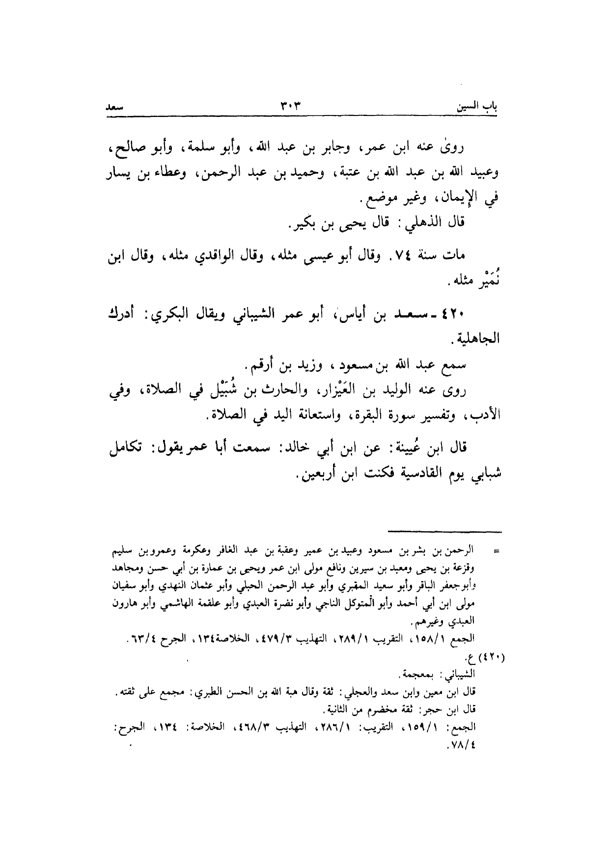 420 - سعد بن إِيَاس أَبُو عمر الشَّيْبَانِيّ وَيُقَال الْبكْرِيّ أدْرك الْجَاهِلِيَّة سمع عبد الله بن مَسْعُود وَزيد بن أَرقم رَوَى عَنهُ الْوَلِيد بن الْعيزَار والْحَارث بن شبيل فِي الصَّلَاة وَفِي الْأَدَب وَتَفْسِير سُورَة الْبَقَرَة واستعانة الْيَد فِي الصَّلَاة قَالَ ابْن عُيَيْنَة عَن ابْن أبي خَالِد سَمِعت أَبَا عمر يَقُول تَكَامل شَبَابِي يَوْم الْقَادِسِيَّة فَكنت ابْن أَرْبَعِينَ