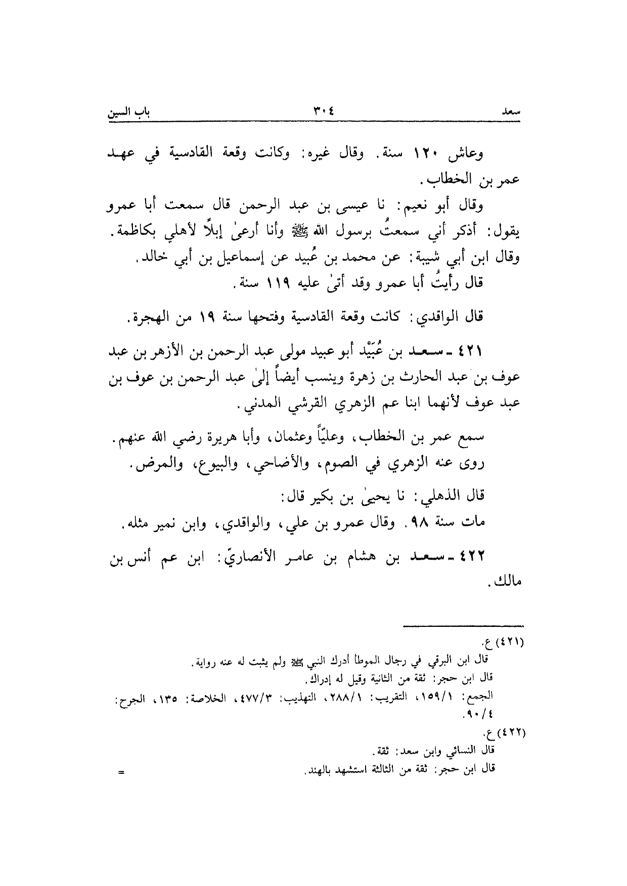421 - سعد بن عبيد أَبُو عبيد مولَى عبد الرَّحْمَن بن الْأَزْهَر بن عبد عَوْف بن عبد الْحَارِث بن زهرَة وينسب أَيْضا إِلَى عبد الرَّحْمَن بن عَوْف بن عبد عَوْف لِأَنَّهُمَا أبنا عَم الزُّهْرِيّ الْقرشِي الْمدنِي سمع عمر بن الْخطاب وعليا وَعُثْمَان وَأَبا هُرَيْرَة رَضِي الله عَنْهُم رَوَى عَنهُ الزُّهْرِيّ فِي الصَّوْم وَالْأَضَاحِي والبيوع وَالْمَرَض قَالَ الذهلي نَا يَحْيَى بن بكير قَالَ مَاتَ سنة 98 وَقَالَ عَمْرو بن عَلّي والواقدي وَابْن نمير مثله