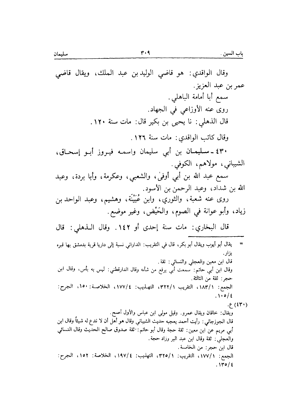 430 - سُلَيْمَان بن أبي سُلَيْمَان واسْمه فَيْرُوز أَبُو إِسْحَاق الشَّيْبَانِيّ مَوْلَاهُم الْكُوفِي سمع عبد الله بن أبي أَوْفَى وَالشعْبِيّ وَعِكْرِمَة وَأَبا بردة وَعبد الله بن شَدَّاد وَعبد الرَّحْمَن بن الْأسود رَوَى عَنهُ شُعْبَة وَالثَّوْري وَابْن عُيَيْنَة وهشيم وَعبد الْوَاحِد بن زِيَاد وَأَبُو عوَانَة فِي الصَّوْم وَالْحيض وَغير مَوضِع قَالَ البُخَارِيّ مَاتَ سنة إِحْدَى أَو 142 وَقَالَ الذهلي قَالَ