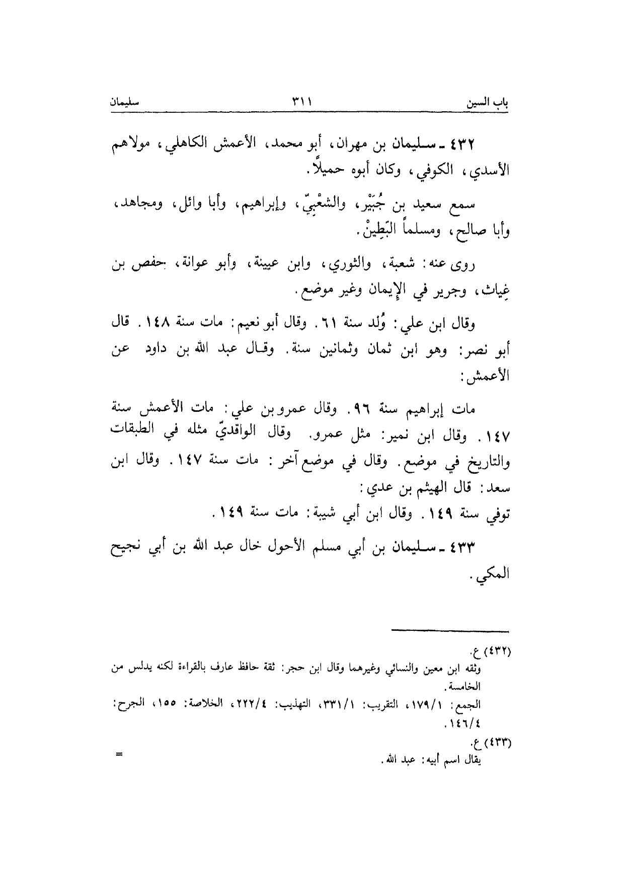 432 - سُلَيْمَان بن مهْرَان أَبُو مُحَمَّد الْأَعْمَش الْكَاهِلِي مَوْلَاهُم الْأَسدي الْكُوفِي وَكَانَ أَبوهُ حميلا سمع سعيد جُبَير وَالشعْبِيّ وَإِبْرَاهِيم وَأَبا وَائِل وَمُجاهد وَأَبا صَالح وَمُسلمًا البطين رَوَى عَنهُ شُعْبَة وَالثَّوْري وَابْن عُيَيْنَة وَأَبُو عوَانَة حَفْص بن غياث وَجَرِير فِي الْإِيمَان وَغير مَوضِع وَقَالَ ابْن عَلّي ولد سنة 61 وَقَالَ أَبُو نعيم مَاتَ سنة 148 قَالَ أَبُو نصر وَهُوَ ابْن ثَمَان وَثَمَانِينَ سنة وَقَالَ عبد الله بن دَاوُد عَن الْأَعْمَش مَاتَ إِبْرَاهِيم سنة 96 وَقَالَ عَمْرو بن عَلّي مَاتَ الْأَعْمَش سنة 147 وَقَالَ ابْن نمير مثل عَمْرو وَقَالَ الْوَاقِدِيّ مثله فِي الطَّبَقَات والتاريخ فِي مَوضِع وَقَالَ فِي مَوضِع آخر مَاتَ سنة 147 وَقَالَ ابْن سعد قَالَ الْهَيْثَم بن عدي توفّي سنة 149 وَقَالَ ابْن أبي شيبَة مَاتَ سنة 149