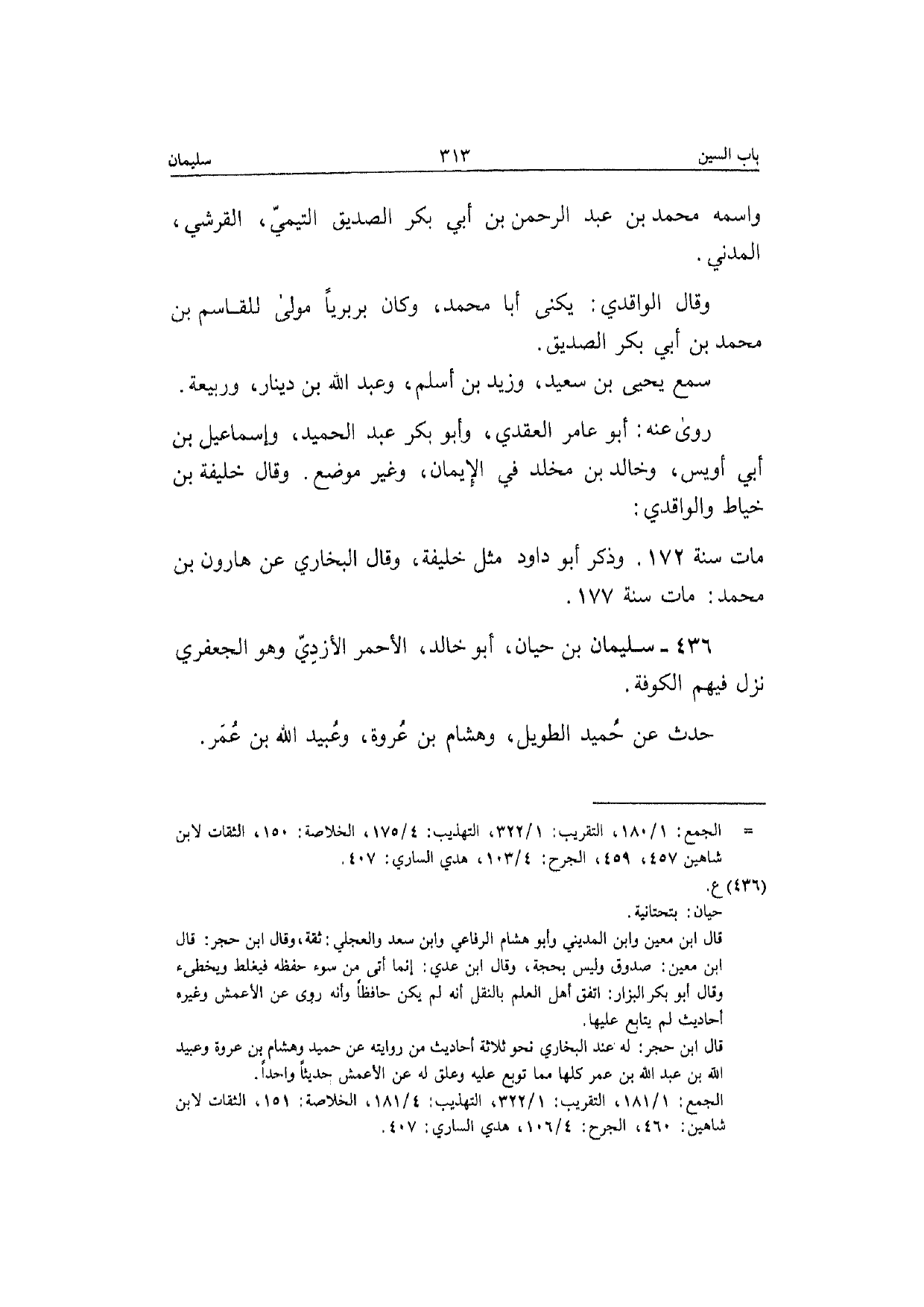 436 - سُلَيْمَان بن حَيَّان أَبُو خَالِد الْأَحْمَر الْأَزْدِيّ وَهُوَ الْجَعْفَرِي نزل فيهم الْكُوفَة حدث عَن حميد الطَّوِيل وَهِشَام بن عُرْوَة وَعبيد الله بن عمر