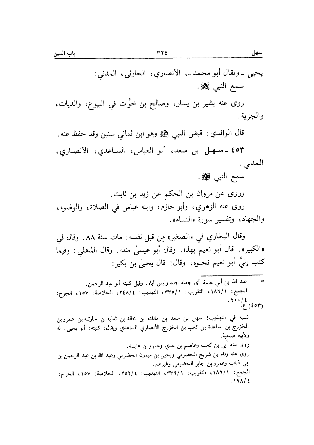 453 - سهل بن سعد أَبُو الْعَبَّاس السَّاعِدِيّ الْأنْصَارِيّ الْمدنِي سمع النَّبِي صَلَّى الله عَلَيْهِ وَسلم وَرَوَى عَن مَرْوَان بن الحكم عَن زيد بن ثَابت رَوَى عَنهُ الزُّهْرِيّ وَأَبُو حَازِم وَابْنه عَبَّاس فِي الصَّلَاة وَالْوُضُوء وَالْجهَاد وَتَفْسِير سُورَة ((النِّسَاء)) وَقَالَ البُخَارِيّ فِي ((الصَّغِير)) من قبل نَفسه مَاتَ سنة 88 وَقَالَ فِي ((الْكَبِير)) قَالَ أَبُو نعيم لهَذَا وَقَالَ أَبُو عِيسَى مثله وَقَالَ الذهلي وَفِيمَا كتب إِلَيّ أَبُو نعيم نَحوه وَقَالَ قَالَ يَحْيَى بن بكير