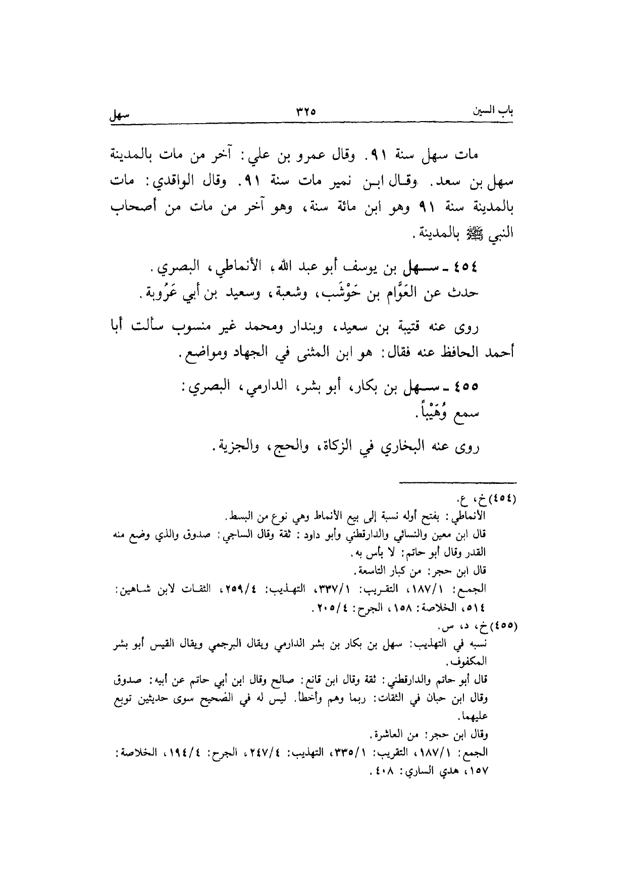 454 - سهل بن يُوسُف أَبُو عبد الله الْأنمَاطِي الْبَصْرِيّ حدث عَن الْعَوام بن حَوْشَب وَشعْبَة وَسَعِيد بن أبي عرُوبَة رَوَى عَنهُ قُتَيْبَة بن سعيد وَبُنْدَار وَمُحَمّد غير مَنْسُوب سَأَلت أَبَا أَحْمد الْحَافِظ عَنهُ فَقَالَ هُوَ ابْن الْمثنى فِي الْجِهَاد ومواضع