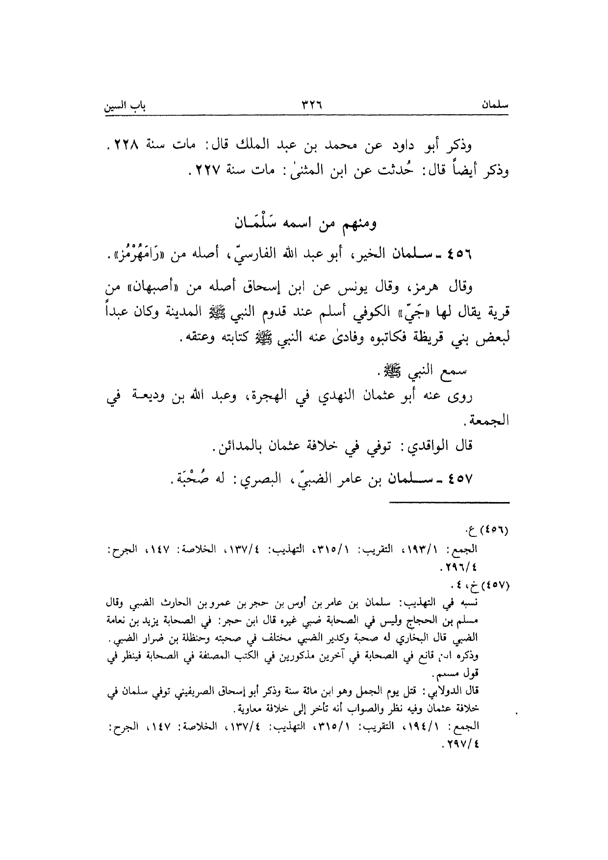 456 - سلمَان الْخَيْر أَبُو عبد الله الْفَارِسِي أَصله من ((رامهرمز)) وَقَالَ هُرْمُز وَقَالَ يُونُس عَن ابْن إِسْحَاق أَصله من ((أَصْبَهَان)) من قَرْيَة يُقَال لَهَا ((جي)) الْكُوفِي أسلم عِنْد قدوم النَّبِي صَلَّى الله عَلَيْهِ وَسلم الْمَدِينَة وَكَانَ عبدا لبَعض بني قُرَيْظَة فكاتبوه وفادى عَنهُ النَّبِي صَلَّى الله عَلَيْهِ وَسلم كِتَابَته وعتقه سمع النَّبِي صَلَّى الله عَلَيْهِ وَسلم رَوَى عَنهُ أَبُو عُثْمَان النَّهْدِيّ فِي الْهِجْرَة وَعبد الله بن وَدِيعَة فِي الْجُمُعَة قَالَ الْوَاقِدِيّ توفّي فِي خلَافَة عُثْمَان بِالْمَدَائِنِ