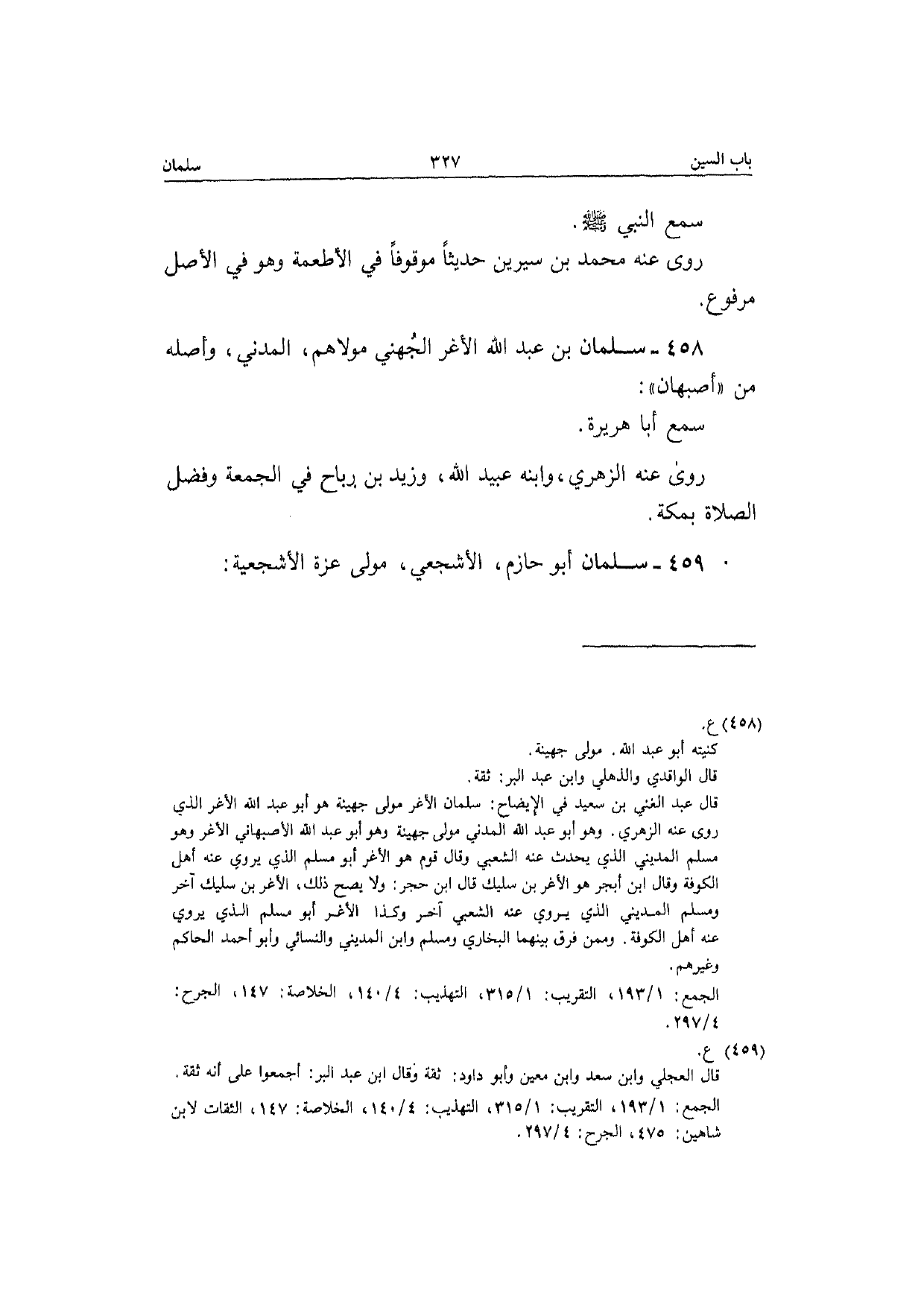 458 - سلمَان بن عبد الله الْأَغَر الْجُهَنِيّ مَوْلَاهُم الْمدنِي واصله من أَصْبَهَان سمع أَبَا هُرَيْرَة رَوَى عَنهُ الزُّهْرِيّ وَابْنه عبيد الله وَزيد بن رَبَاح فِي الْجُمُعَة وَفضل الصَّلَاة بِمَكَّة