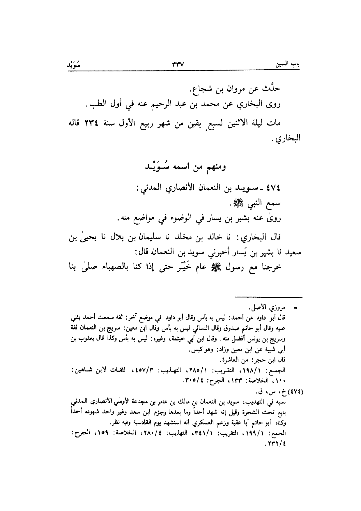 474 - سُوَيْد بن النُّعْمَان الْأنْصَارِيّ الْمدنِي سمع النَّبِي صَلَّى الله عَلَيْهِ وَسلم رَوَى عَنهُ بشير بن يسَار ي الْوضُوء فِي مَوَاضِع مِنْهُ قَالَ البُخَارِيّ نَا خَالِد بن مخلد نَا سُلَيْمَان بن بِلَال نَا يَحْيَى بن سعيد نَا بشير بن يسَار أَخْبرنِي سُوَيْد بن النُّعْمَان قَالَ خرجنَا مَعَ رَسُول الله صَلَّى الله عَلَيْهِ وَسلم عَام خَيْبَر حَتَّى إِذا كُنَّا بالصهباء صَلَّى بِنَا