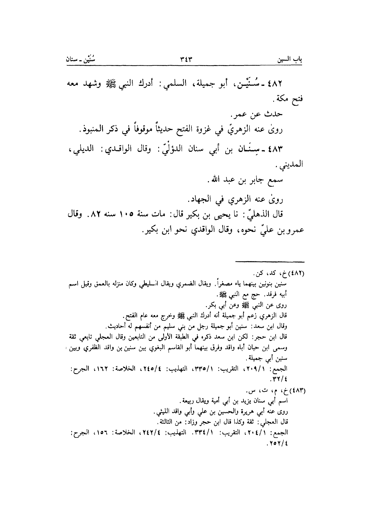 482 - سِنِين أَبُو جميلَة السّلمِيّ أدْرك النَّبِي صَلَّى الله عَلَيْهِ وَسلم وَشهد مَعَه فتح مَكَّة حدث عَن عمر رَوَى عَنهُ الزُّهْرِيّ فِي غَزْوَة الْفَتْح حَدِيثا مَوْقُوفا فِي ذكر المنبوذ