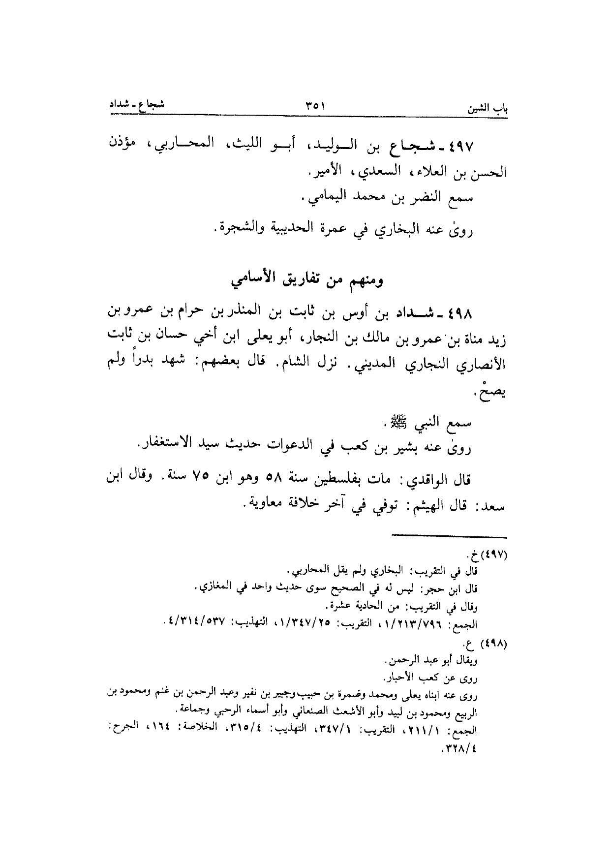 497 - شُجَاع بن الْوَلِيد أَبُو اللَّيْث الْمحَاربي مُؤذن الْحسن بن الْعَلَاء السَّعْدِيّ الْأَمِير سمع النَّضر بن مُحَمَّد اليمامي رَوَى عَنهُ البُخَارِيّ فِي عمْرَة الْحُدَيْبِيَة والشجرة