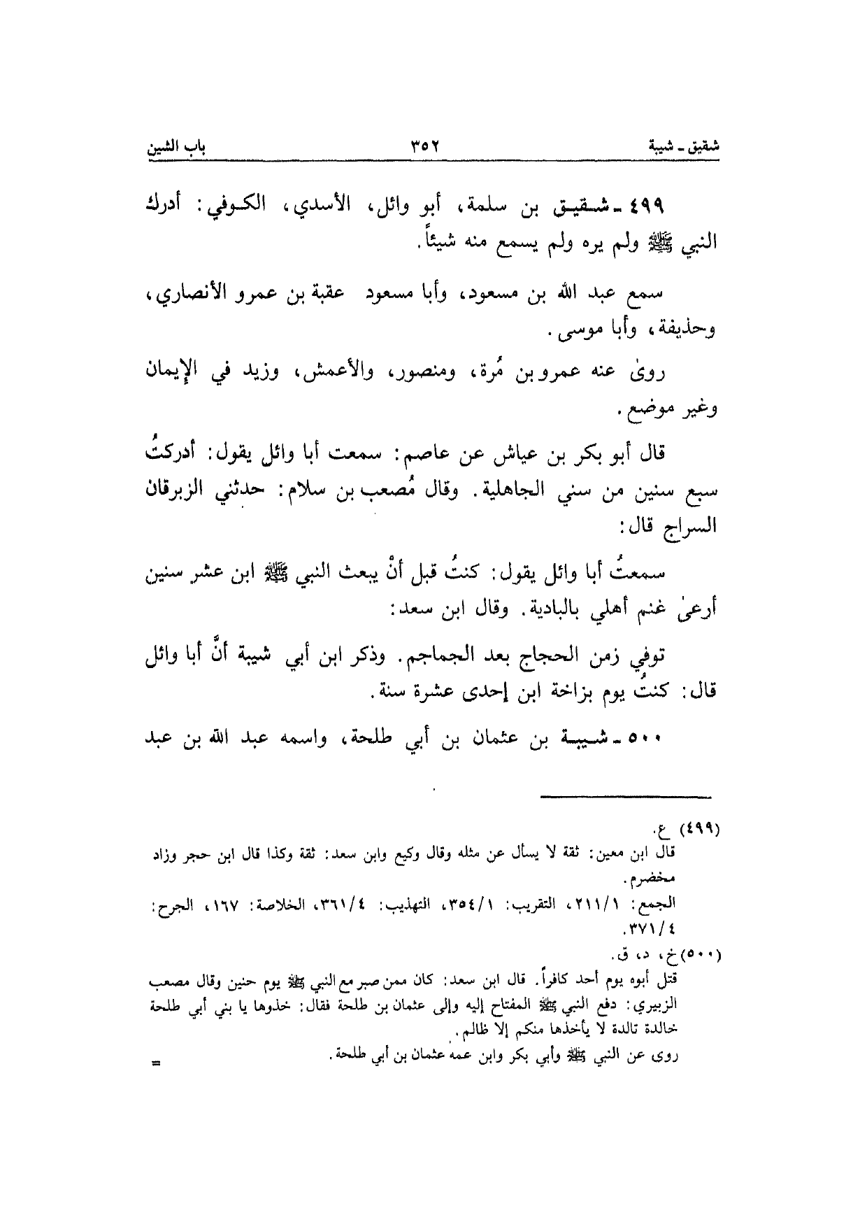 499 - شَقِيق بن سَلمَة أَبُو وَائِل الْأَسدي الْكُوفِي أدْرك النَّبِي صَلَّى الله عَلَيْهِ وَسلم وَلم يره وَلم يسمع مِنْهُ شَيْئا سمع عبد الله بن مَسْعُود وَأَبا مَسْعُود عقبَة بن عَمْرو الْأنْصَارِيّ وَحُذَيْفَة وَأَبا مُوسَى رَوَى عَنهُ عَمْرو بن مرّة وَمَنْصُور وَالْأَعْمَش وَزيد فِي الْإِيمَان وَغير مَوضِع قَالَ أَبُو بكر بن عَيَّاش بن عَاصِم سَمِعت أَبَا وَائِل يَقُول أدْركْت سبع سِنِين من سني الْجَاهِلِيَّة وَقَالَ مُصعب بن سَلام حَدثنِي الزبْرِقَان السراج قَالَ سَمِعت أَبَا وَائِل يَقُول كنت قبل أَن يبْعَث النَّبِي صَلَّى الله عَلَيْهِ وَسلم ابْن عشر سِنِين أرعى غنم أَهلِي بالبادية وَقَالَ ابْن سعد توفّي زمن الْحجَّاج بعد الجماجم وَذكر ابْن أبي شيبَة أَن أَبَا وَائِل قَالَ كنت يَوْم بزاخة ابْن إِحْدَى عشرَة سنة