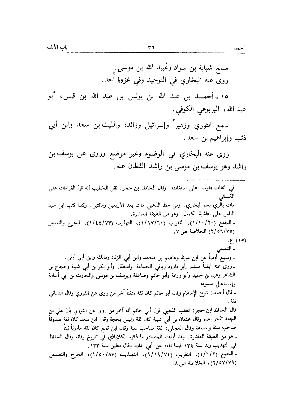 15 - أَحْمد بن عبد الله بن يُونُس بن عبد الله بن قيس أَبُو عبد الله الْيَرْبُوعي الْكُوفِي سمع الثَّوْريّ وزهيرا وَإِسْرَائِيل وزائدة وَاللَّيْث بن سعد وَابْن أبي ذِئْب وَإِبْرَاهِيم بن سعد رَوَى عَنهُ البُخَارِيّ فِي الْوضُوء وَغير مَوضِع وَرَوَى عَن يُوسُف بن رَاشد وَهُوَ يُوسُف بن مُوسَى بن رَاشد الْقطَّان عَنهُ