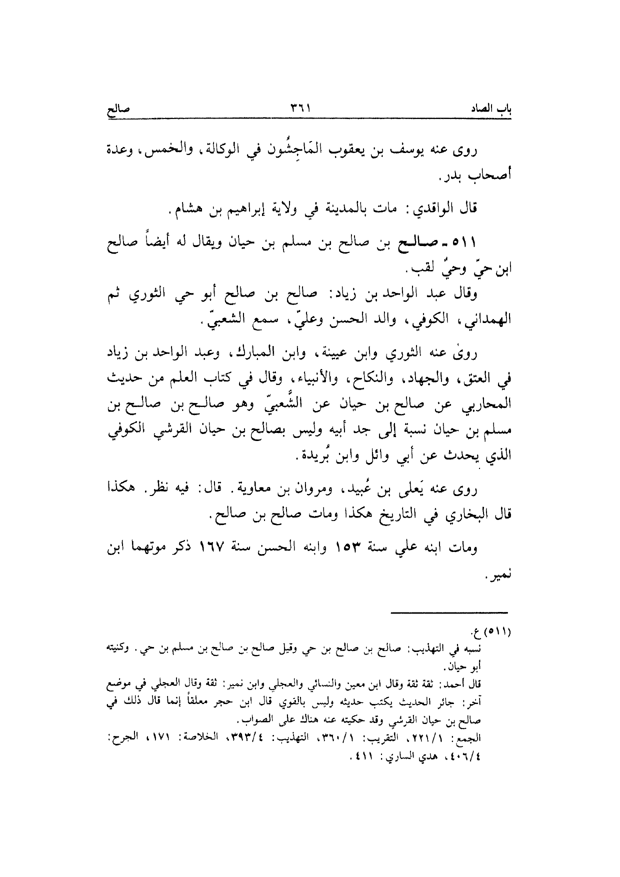 511 - صَالح بن صَالح بن مُسلم بن حَيَّان وَيُقَال لَهُ أَيْضا صَالح ابْن حَيّ وَحي لقب وَقَالَ عبد الْوَاحِد بن زِيَاد صَالح بن صَالح أَبُو حَيّ الثَّوْريّ ثمَّ الْهَمدَانِي الْكُوفِي وَالِد الْحسن وَعلي سمع الشّعبِيّ رَوَى عَنهُ الثَّوْريّ وَابْن عُيَيْنَة وَابْن الْمُبَارك وَعبد الْوَاحِد بن زِيَاد فِي الْعتْق وَالْجهَاد وَالنِّكَاح والأنبياء وَقَالَ فِي كتاب الْعلم من حَدِيث المحازي عَن صَالح بن حَيَّان عَن الشّعبِيّ وَهُوَ صَالح بن صَالح بن مُسلم بن حَيَّان نِسْبَة إِلَى جد أَبِيه وَلَيْسَ بِصَالح بن حَيَّان الْقرشِي الْكُوفِي الَّذِي يحدث عَن أبي وَائِل وَابْن بُرَيْدَة رَوَى عَنهُ يعْلى بن عبيد ومروان بن مُعَاوِيَة قَالَ فِيهِ نظر هَكَذَا قَالَ البُخَارِيّ فِي التَّارِيخ هَكَذَا وَمَات صَالح بن صَالح وَمَات ابْنه عَلّي سنة 153 وَابْنه الْحسن سنة 167 ذكر مَوْتهمَا ابْن نمير