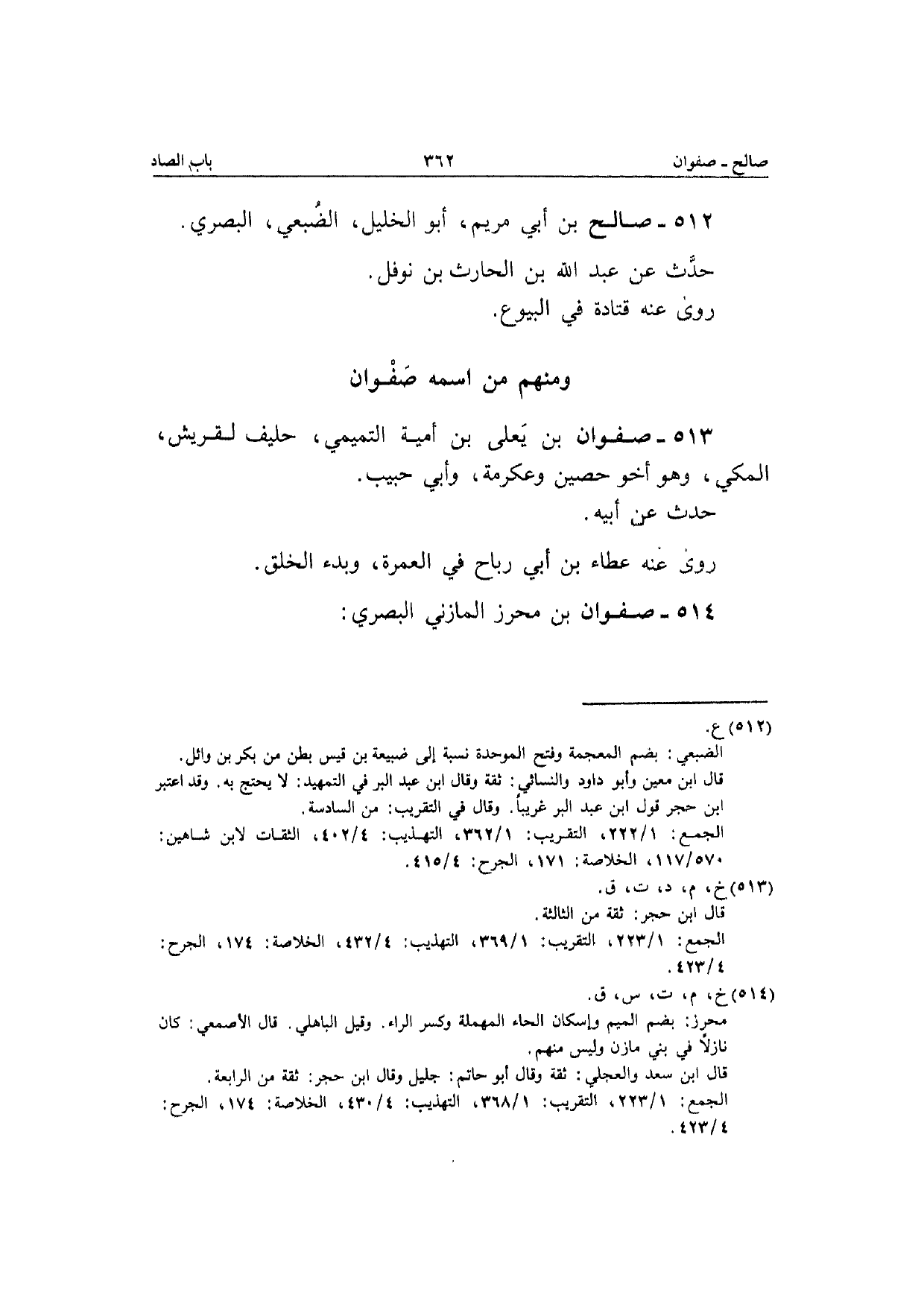 512 - صَالح بن أبي مَرْيَم أَبُو الْخَلِيل الضبعِي الْبَصْرِيّ حدث عَن عبد الله بن الْحَارِث بن نَوْفَل رَوَى عَنهُ قَتَادَة فِي الْبيُوع