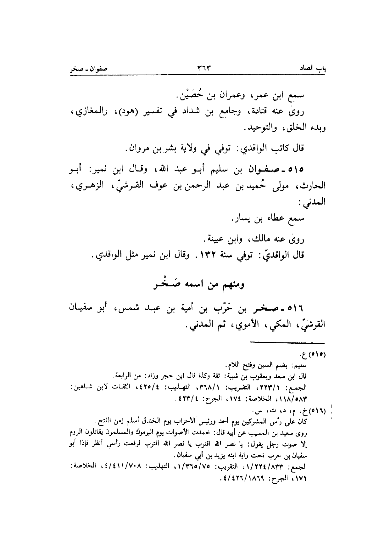 515 - صَفْوَان بن سليم أَبُو عبد الله وَقَالَ ابْن نمير أَبُو الْحَارِث مولَى حميد بن عبد الرَّحْمَن بن عَوْف الْقرشِي الزُّهْرِيّ الْمدنِي سمع عَطاء بن يسَار رَوَى عَنهُ مَالك وَابْن عُيَيْنَة قَالَ الْوَاقِدِيّ توفّي سنة 132 وَقَالَ ابْن نمير مثل الْوَاقِدِيّ