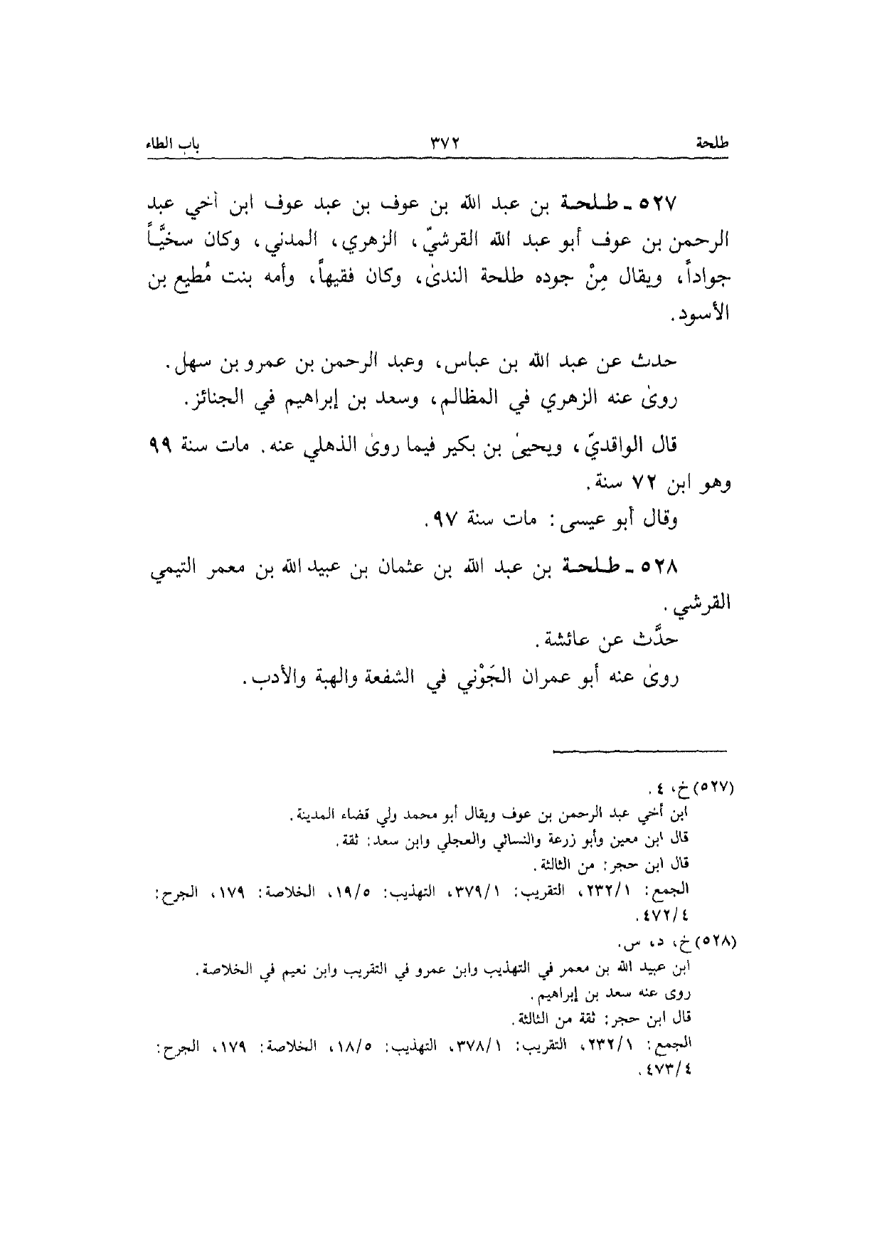527 - طَلْحَة بن عبد الله بن عَوْف بن عبد عَوْف بن أخي عبد الرَّحْمَن بن عَوْف أَبُو عبد الله الْقرشِي الزُّهْرِيّ الْمدنِي وَكَانَ سخيا جوادا وَيُقَال من جوده طَلْحَة الندى وَكَانَ فَقِيها نو وَأمه بنت مُطِيع بن الْأسود حدث عَن عبد الله بن عَبَّاس وَعبد الرَّحْمَن بن عَمْرو بن سهل رَوَى عَنهُ الزُّهْرِيّ فِي الْمَظَالِم وَسعد بن إِبْرَاهِيم فِي الْجَنَائِز قَالَ الْوَاقِدِيّ وَيَحْيَى بن بكير فِيمَا رَوَى الذهلي عَنهُ مَاتَ سنة 99 وَهُوَ ابْن 72 سنة وَقَالَ أَبُو عِيسَى مَاتَ سنة 97