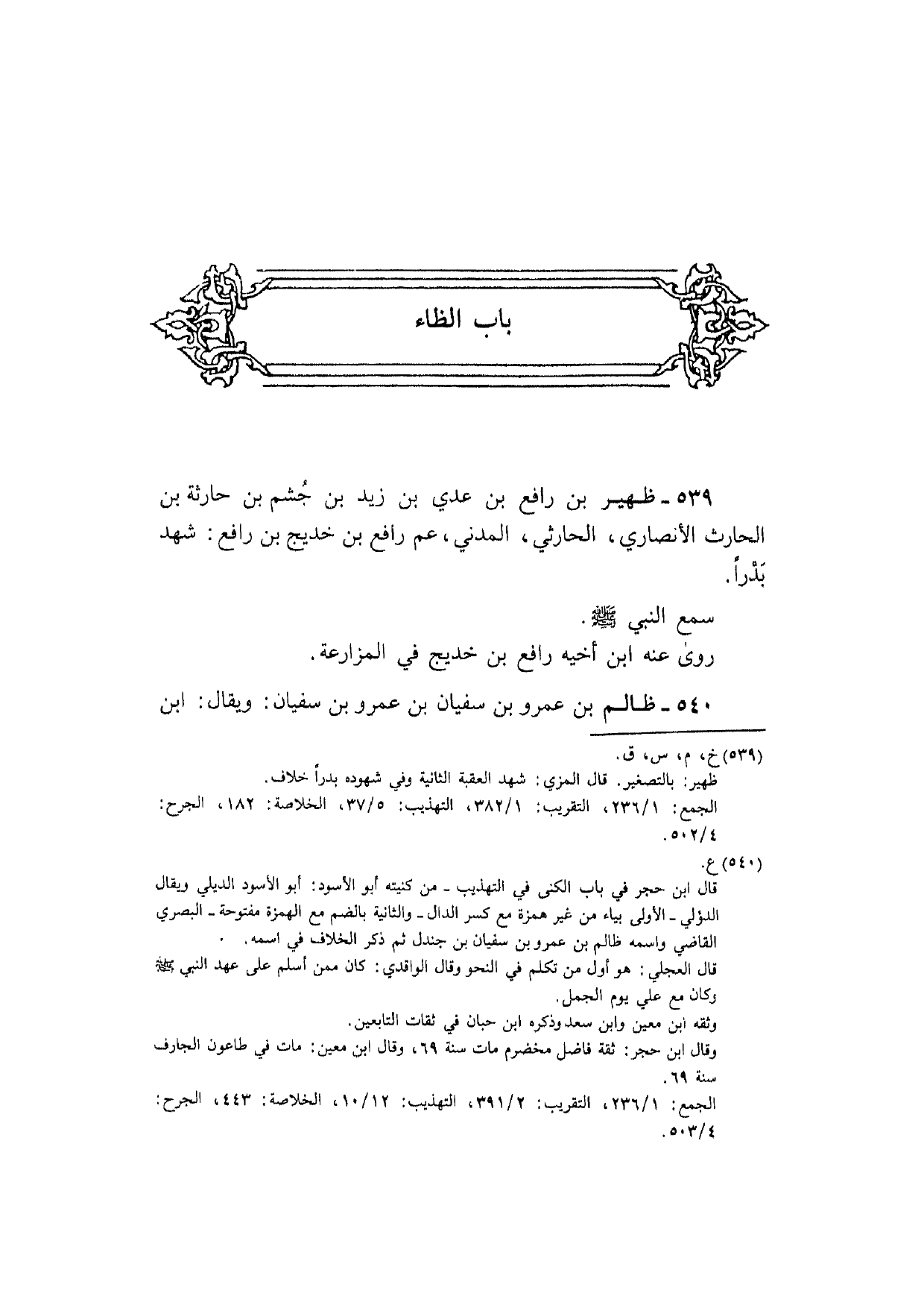 539 - ظهير بن رَافع بن عدي بن زيد بن جشم بن حَارِثَة بن الْحَارِث الْأنْصَارِيّ الْحَارِثِيّ الْمدنِي عَم رَافع بن خديج بن رَافع شهد بَدْرًا سمع النَّبِي صَلَّى الله عَلَيْهِ وَسلم رَوَى عَنهُ ابْن أَخِيه رَافع بن خديج فِي الْمُزَارعَة