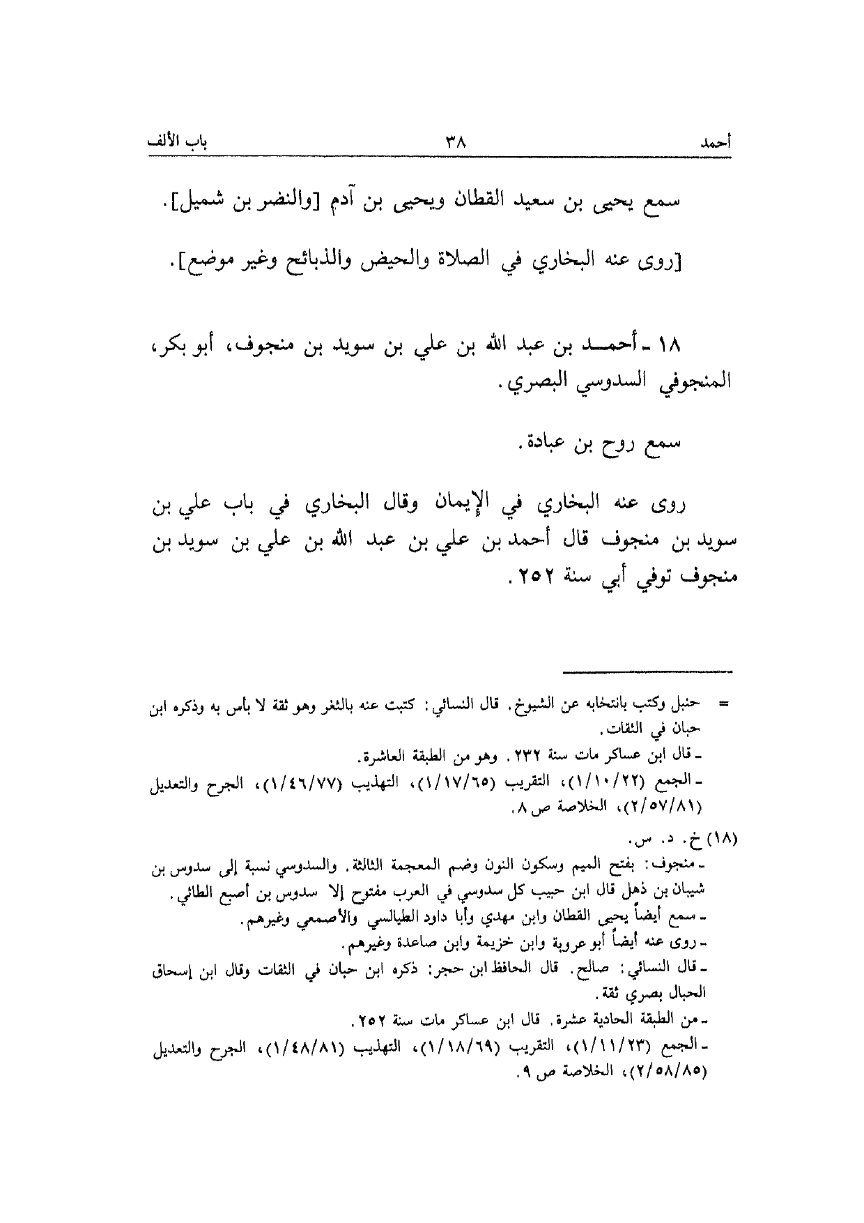 18 - أَحْمد بن عبد الله بن عَلّي بن سُوَيْد بن منجوف أَبُو بكر المنجوفي السدُوسِي الْبَصْرِيّ سمع روح بن عبَادَة رَوَى عَنهُ البُخَارِيّ فِي الْإِيمَان وَقَالَ البُخَارِيّ فِي بَاب عَلّي بن سُوَيْد بن منجوف قَالَ أَحْمد بن عَلّي بن عبد الله بن عَلّي بن سُوَيْد بن منجوف توفّي أبي سنة 252