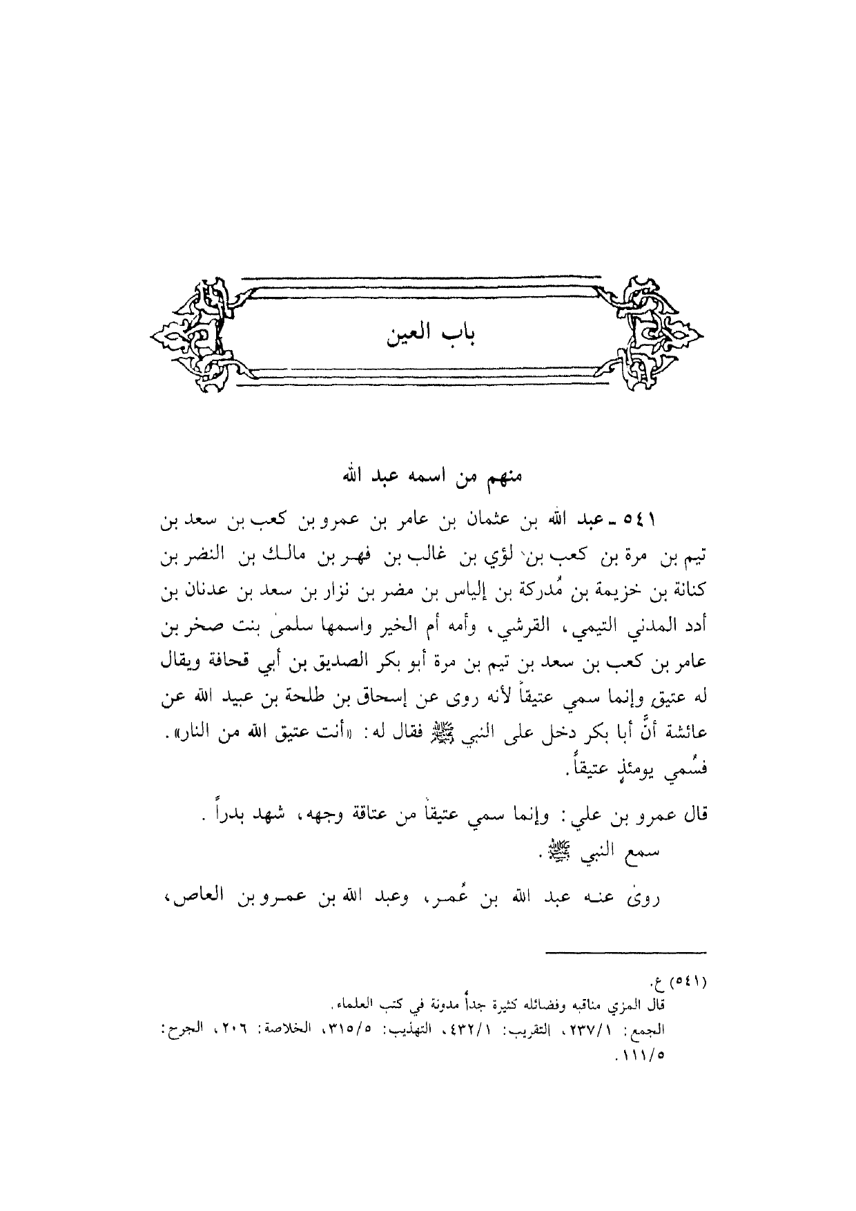 541 - عبد الله بن عُثْمَان بن عَامر بن عَمْرو بن كَعْب بن سعد بن تيم بن مرّة بن كَعْب بن لؤَي بن غَالب بن فهر بن مَالك بن النَّضر بن كنَانَة بن خُزَيْمَة بن مدركة بن إلْيَاس بن مُضر بن نزار بن سعد بن عدنان بن أدد الْمدنِي التَّيْمِيّ الْقرشِي وَأمه أم الْخَيْر وَاسْمهَا سلْمَى بنت صَخْر بن عَامر بن كَعْب بن سعد بن تيم بن مرّة أَبُو بكر الصّديق بن أبي قُحَافَة وَيُقَال لَهُ عَتيق وَإِنَّمَا سمي عتيقا لِأَنَّهُ رَوَى عَن إِسْحَاق بن طَلْحَة بن عبيد الله عَن عَائِشَة أَن أَبَا بكر دخل عَلَى النَّبِي صَلَّى الله عَلَيْهِ وَسلم فَقَالَ لَهُ (أَنْت عَتيق الله من النَّار) فَسُمي يَوْمئِذٍ عتيقا قَالَ عَمْرو بن عَلّي وَإِنَّمَا سمي عتيقا من عتاقة وَجهه شهد بَدْرًا سمع النَّبِي صَلَّى الله عَلَيْهِ وَسلم رَوَى عَنهُ عبد الله بن عمر وَعبد الله بن عَمْرو بن الْعَاصِ