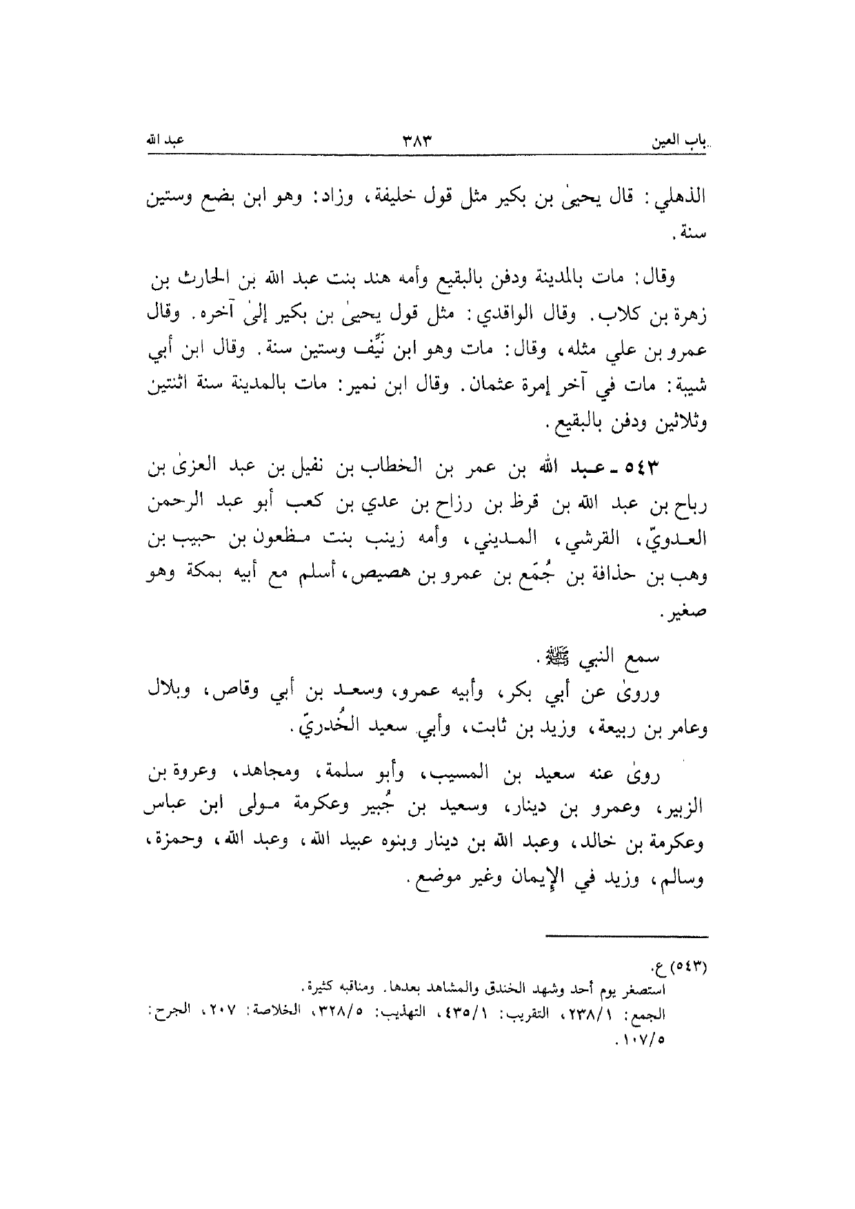 543 - عبد الله بن عمر بن الْخطاب بن نفَيْل بن عبد الْعُزَّى بن رَبَاح بن عبد الله بن قرظ بن رزاح بن عدي بن كَعْب أَبُو عبد الرَّحْمَن الْعَدوي الْقرشِي الْمَدِينِيّ وَأمه زَيْنَب بنت مَظْعُون بن حبيب بن وهب بن حذافة بن جمع بن عَمْرو بن هصيص أسلم مَعَ أَبِيه بِمَكَّة وَهُوَ صَغِير سمع النَّبِي صَلَّى الله عَلَيْهِ وَسلم وَرَوَى عَن أبي بكر وَأَبِيهِ عَمْرو وَسعد بن أبي وَقاص وبلال وعامر بن ربيعَة وَزيد بن ثَابت وَأبي سعيد الْخُدْرِيّ رَوَى عَنهُ سعيد بن الْمسيب وَأَبُو سَلمَة وَمُجاهد وَعُرْوَة بن الزبير وَعَمْرو بن دِينَار وَسَعِيد بن جُبَير وَعِكْرِمَة مولَى ابْن عَبَّاس وَعِكْرِمَة بن خَالِد وَعبد الله بن دِينَار وَبَنوهُ عبيد الله وَعبد الله وَحَمْزَة وَسَالم وَزيد فِي الْإِيمَان وَغير مَوضِع