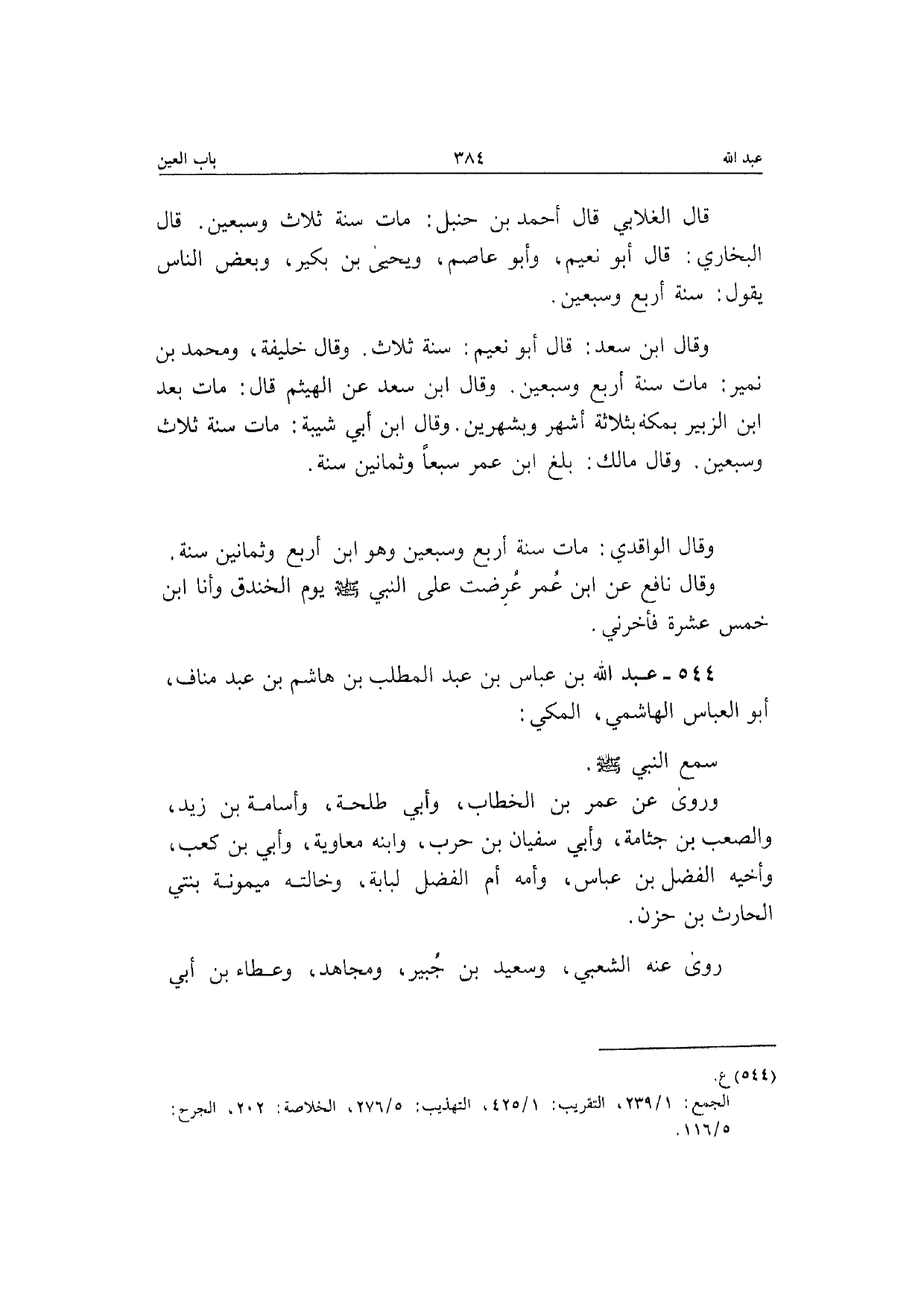 544 - عبد الله بن عَبَّاس بن عبد الْمطلب بن هَاشم بن عبد منَاف أَبُو الْعَبَّاس الْهَاشِمِي الْمَكِّيّ سمع النَّبِي صَلَّى الله عَلَيْهِ وَسلم وَرَوَى عَن عمر بن الْخطاب وَأبي طَلْحَة والسامة بن زيد والصعب بن جثامة وَأبي سُفْيَان بن حَرْب وَابْنه مُعَاوِيَة وَأبي بن كَعْب وأخيه الْفضل بن عَبَّاس وَأمه أم الْفضل لبَابَة وخالته مَيْمُونَة بِنْتي الْحَارِث بن حزن رَوَى عَنهُ الشّعبِيّ وَسَعِيد بن جُبَير وَمُجاهد وَعَطَاء بن أبي