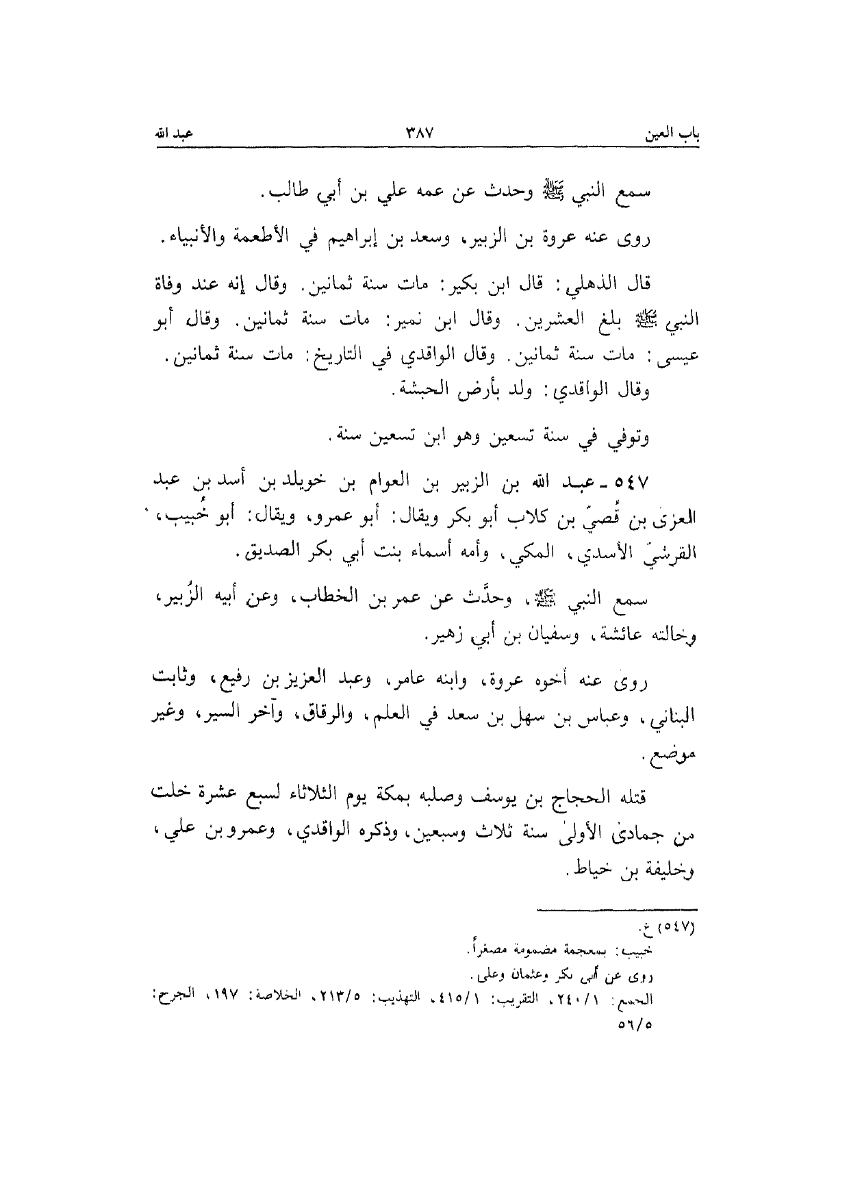 547 - عبد الله بن الزبير بن الْعَوام بن خويلد بن أَسد بن عبد الْعُزَّى بن قصي بن كلاب أَبُو بكر وَيُقَال أَبُو عَمْرو وَيُقَال أَبُو خبيب الْقرشِي الْأَسدي الْمَكِّيّ وَأمه أَسمَاء بنت أبي بكر الصّديق سمع النَّبِي صَلَّى الله عَلَيْهِ وَسلم وَحدث عَن عمر بن الْخطاب وَعَن أَبِيه الزبير وخالته عَائِشَة وسُفْيَان بن أبي زُهَيْر رَوَى عَنهُ أَخُوهُ عُرْوَة وَابْنه عَامر وَعبد الْعَزِيز بن رفيع وثابت الْبنانِيّ وعباس بن سهل بن سعد فِي الْعلم والرقاق وَآخر السّير وَغير مَوضِع قَتله الْحجَّاج بن يُوسُف وصلبه بِمَكَّة يَوْم الثُّلَاثَاء لسبع عشرَة خلت من جُمَادَى الأولَى سنة ثَلَاث وَسبعين وَذكره الْوَاقِدِيّ وَعَمْرو بن عَلّي وَخَلِيفَة بن خياط