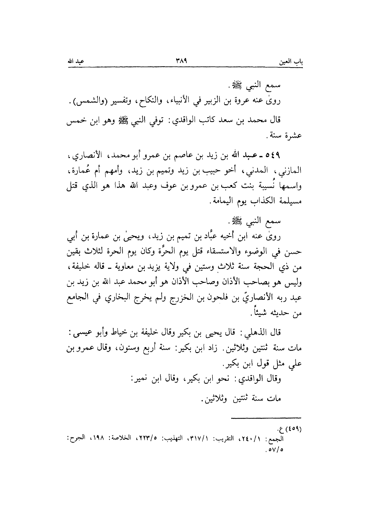 549 - عبد الله بن زيد بن عَاصِم بن عَمْرو أَبُو مُحَمَّد الْأنْصَارِيّ الْمَازِني الْمدنِي أَخُو حبيب بن زيد وَتَمِيم بن زيد وأمهم أم عمَارَة وَاسْمهَا نسيبة بنت كَعْب بن عَمْرو بن عَوْف وَعبد الله هَذَا هُوَ الَّذِي قتل مُسَيْلمَة الْكذَّاب يَوْم الْيَمَامَة سمع النَّبِي صَلَّى الله عَلَيْهِ وَسلم رَوَى عَنهُ ابْن أَخِيه عباد بن تَمِيم بن زيد وَيَحْيَى بن عمَارَة بن أبي حسن فِي الْوضُوء وَالِاسْتِسْقَاء قتل يَوْم الْحرَّة وَكَانَ يَوْم الْحرَّة لثلاث بَقينَ من ذِي الْحجَّة سنة ثَلَاث وَسِتِّينَ فِي ولَايَة يزِيد بن مُعَاوِيَة قَالَه خَليفَة وَلَيْسَ هُوَ بِصَاحِب الْأَذَان وَصَاحب الْأَذَان هُوَ أَبُو مُحَمَّد عبد الله بن زيد بن عبد ربه الْأنْصَارِيّ بن فلحون بن الْخَزْرَج وَلم يخرج البُخَارِيّ فِي الْجَامِع من حَدِيثه شَيْئا