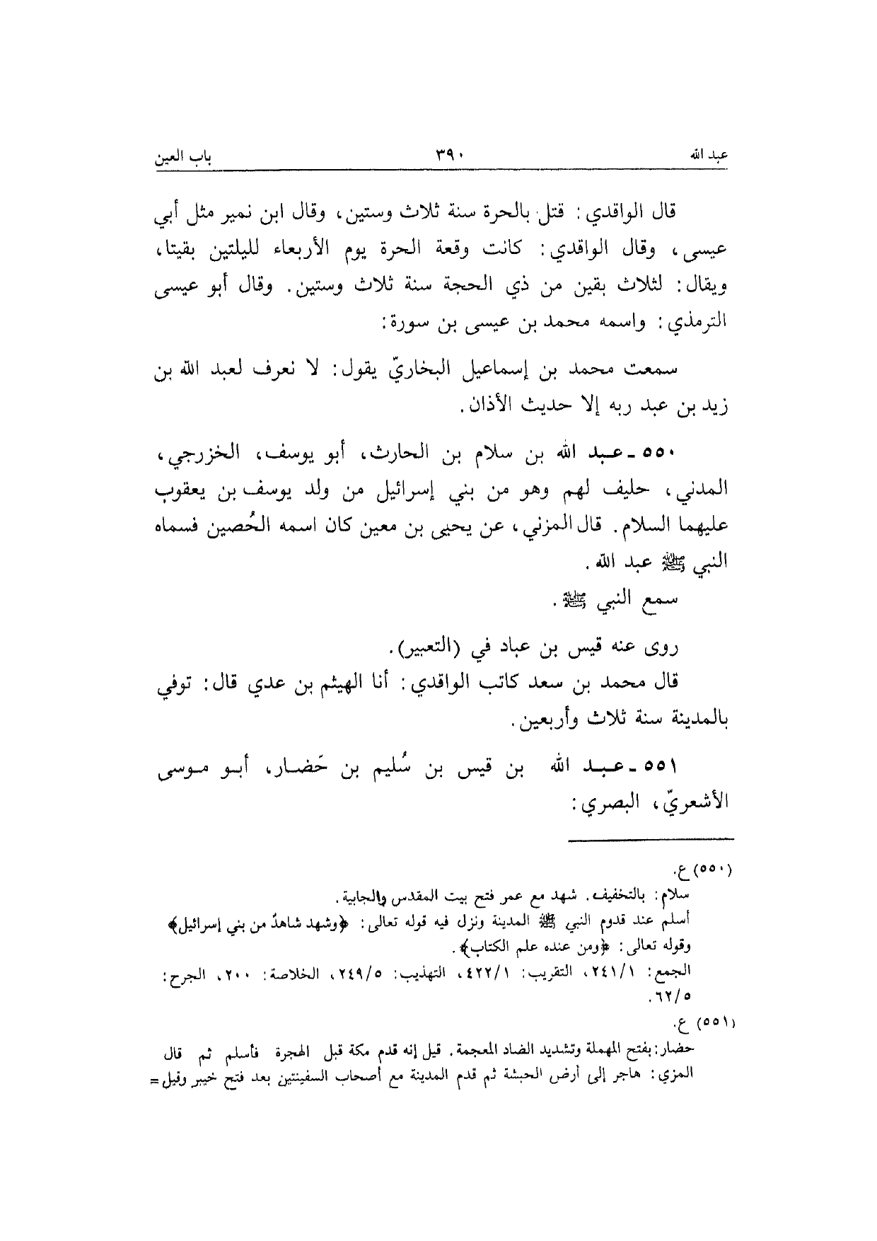 550 - عبد الله بن سَلام بن الْحَارِث أَبُو يُوسُف الخزرجي الْمدنِي حَلِيف لَهُم وَهُوَ من بني إِسْرَائِيل من ولد يُوسُف بن يَعْقُوب عَلَيْهِمَا السَّلَام قَالَ الْمُزنِيّ عَن يَحْيَى بن معِين كَانَ اسْمه الْحصين فَسَماهُ النَّبِي صَلَّى الله عَلَيْهِ وَسلم عبد الله سمع النَّبِي صَلَّى الله عَلَيْهِ وَسلم رَوَى عَن قيس بن عباد فِي (التَّعْبِير) قَالَ مُحَمَّد بن سعد كَاتب الْوَاقِدِيّ أَنا الْهَيْثَم بن عدي قَالَ توفّي بِالْمَدِينَةِ سنة ثَلَاث وَأَرْبَعين