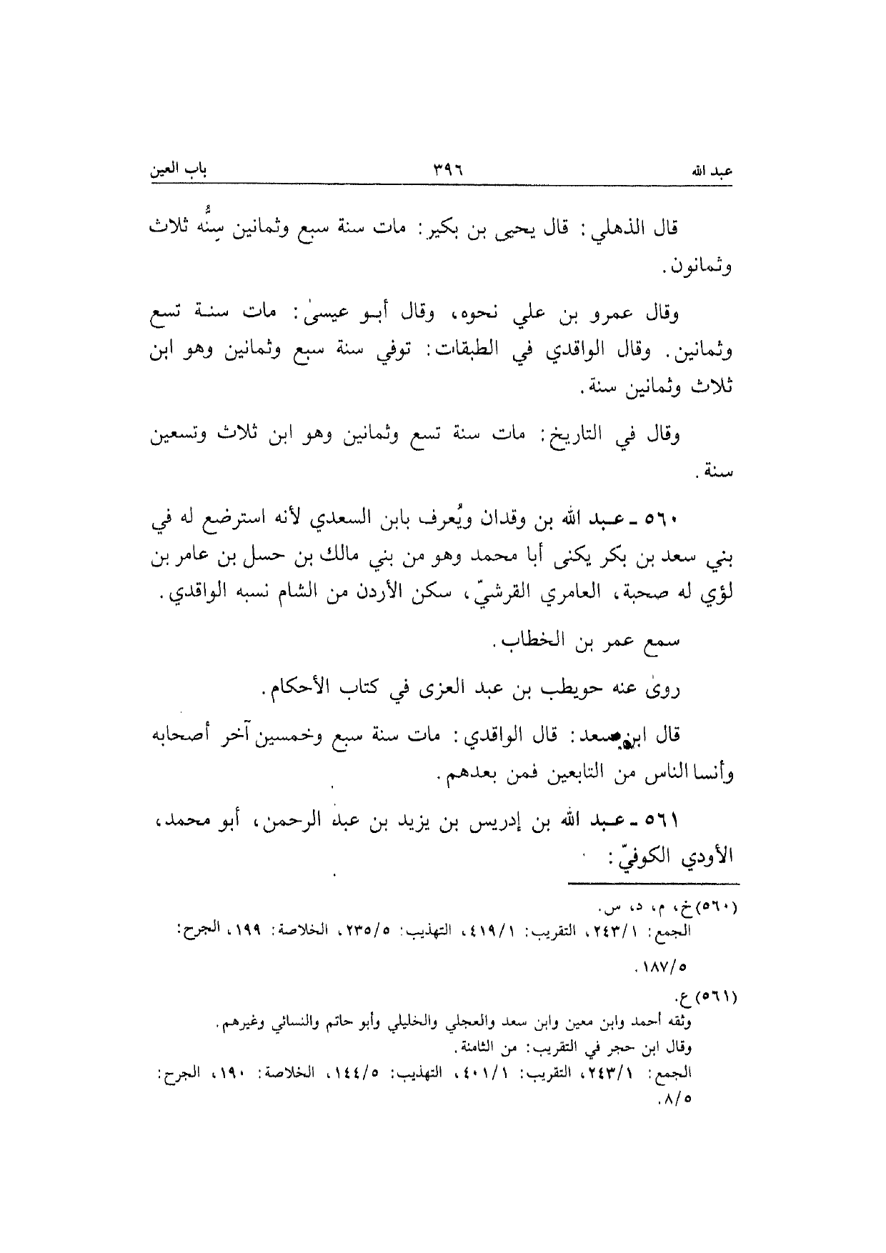 560 - عبد الله بن وقدان وَيعرف بِابْن السَّعْدِيّ لِأَنَّهُ استرضع لَهُ فِي بني سعد بن بكر يكنى أَبَا مُحَمَّد وَهُوَ من بني مَالك بن حسل بن عَامر بن لؤَي لَهُ صُحْبَة العامري الْقرشِي سكن الْأُرْدُن من الشَّام نسبه الْوَاقِدِيّ سمع عمر بن الْخطاب رَوَى عَنهُ حويطب بن عبد الْعُزَّى فِي كتاب الْأَحْكَام قَالَ ابْن سعد قَالَ الْوَاقِدِيّ مَاتَ سنة سبع وَخمسين آخر أَصْحَابه وأنسا النَّاس من التَّابِعين فَمن بعدهمْ