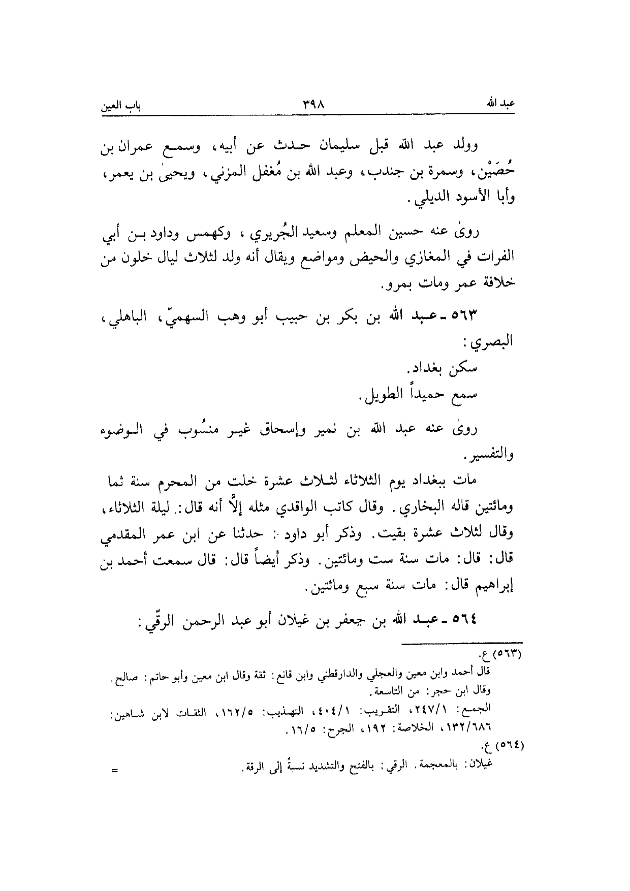 563 - عبد الله بن بكر بن حبيب أَبُو وهب السَّهْمِي الْبَاهِلِيّ الْبَصْرِيّ سكن بَغْدَاد سمع حميدا الطَّوِيل رَوَى عَنهُ عبد الله بن نمير وَإِسْحَاق غير مَنْسُوب فِي الْوضُوء وَالتَّفْسِير مَاتَ بِبَغْدَاد يَوْم الثُّلَاثَاء لثلاث عشرَة خلت من الْمحرم سنة ثَمَان وَمِائَتَيْنِ قَالَه البُخَارِيّ وَقَالَ كَاتب الْوَاقِدِيّ مثله إِلَّا أَنه قَالَ لَيْلَة الثُّلَاثَاء وَقَالَ لثلاث عشرَة بقيت وَذكر أَبُو دَاوُد حَدثنَا عَن ابْن عمر الْمقدمِي قَالَ قَالَ مَاتَ سنة سِتّ وَمِائَتَيْنِ وَذكر أَيْضا قَالَ قَالَ سَمِعت أَحْمد بن إِبْرَاهِيم قَالَ مَاتَ سنة سبع وَمِائَتَيْنِ