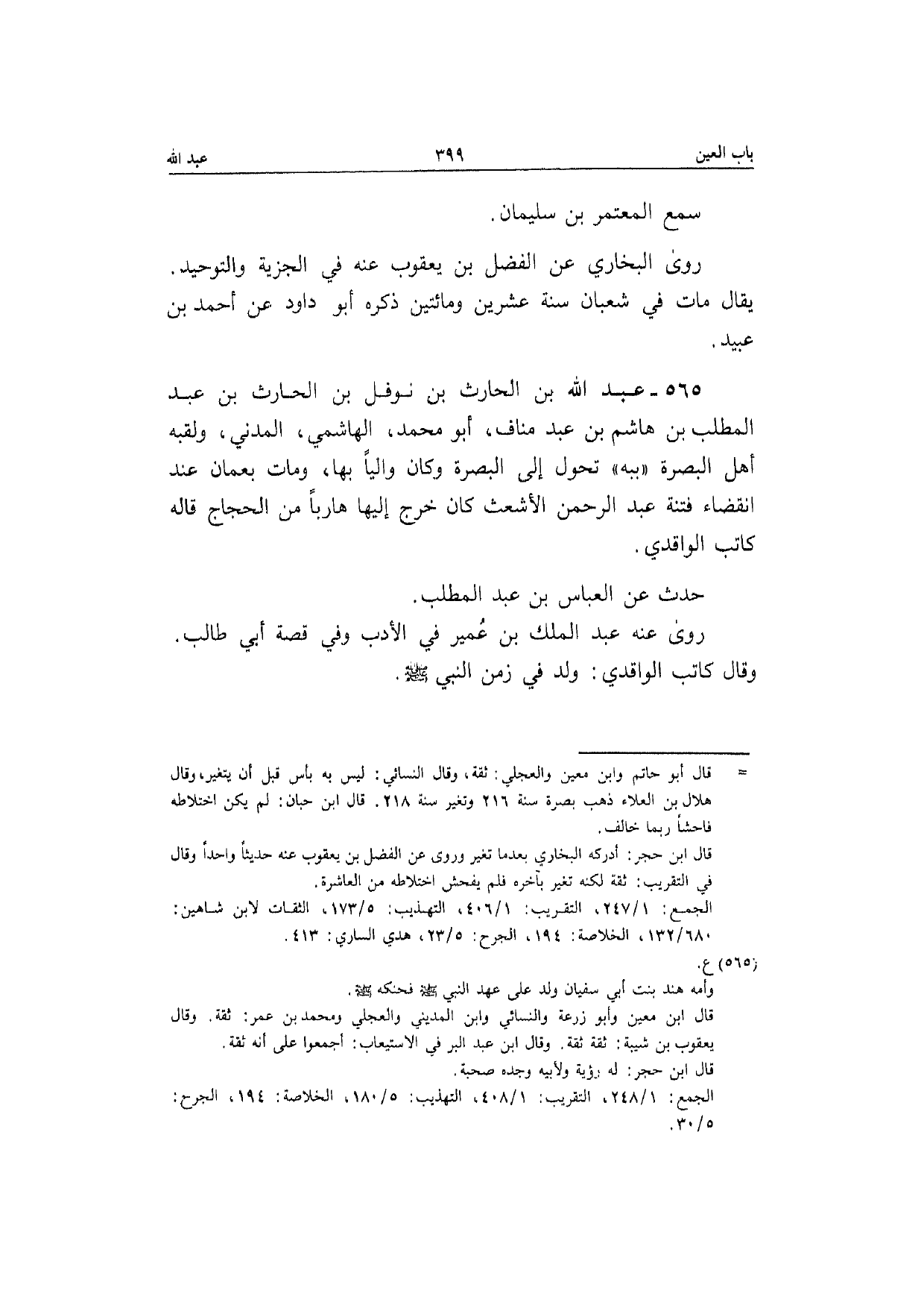 565 - عبد الله بن الْحَارِث بن نَوْفَل بن الْحَارِث بن عبد الْمطلب بن هَاشم بن عبد المناف أَبُو مُحَمَّد الْهَاشِمِي الْمدنِي ولقبه أهل الْبَصْرَة ((ببه)) تحول إِلَى الْبَصْرَة وَكَانَ واليا بهَا وَمَات بعمان عِنْد انْقِضَاء فتْنَة عبد الرَّحْمَن الْأَشْعَث كَانَ خرج إِلَيْهَا هَارِبا من الْحجَّاج قَالَه كَاتب الْوَاقِدِيّ حدث عَن الْعَبَّاس بن عبد الْمطلب رَوَى عَنهُ عبد الْملك بن عُمَيْر فِي الْأَدَب وَفِي قصَّة أبي طَالب وَقَالَ كَاتب الْوَاقِدِيّ ولد فِي زمن النَّبِي صَلَّى الله عَلَيْهِ وَسلم
