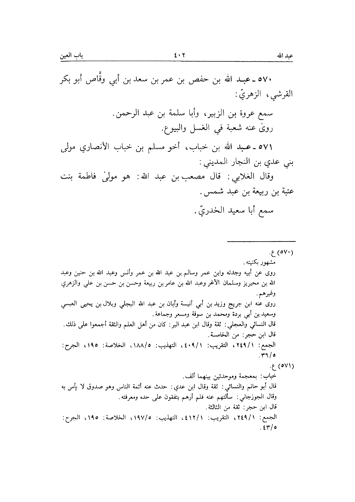 570 - عبد الله بن حَفْص بن عمر بن سعد بن أبي وَقاص أَبُو بكر الْقرشِي الزُّهْرِيّ سمع عُرْوَة بن الزبير وَأَبا سَلمَة بن عبد الحرن رَوَى عَنهُ شُعْبَة فِي الْغسْل والبيوع