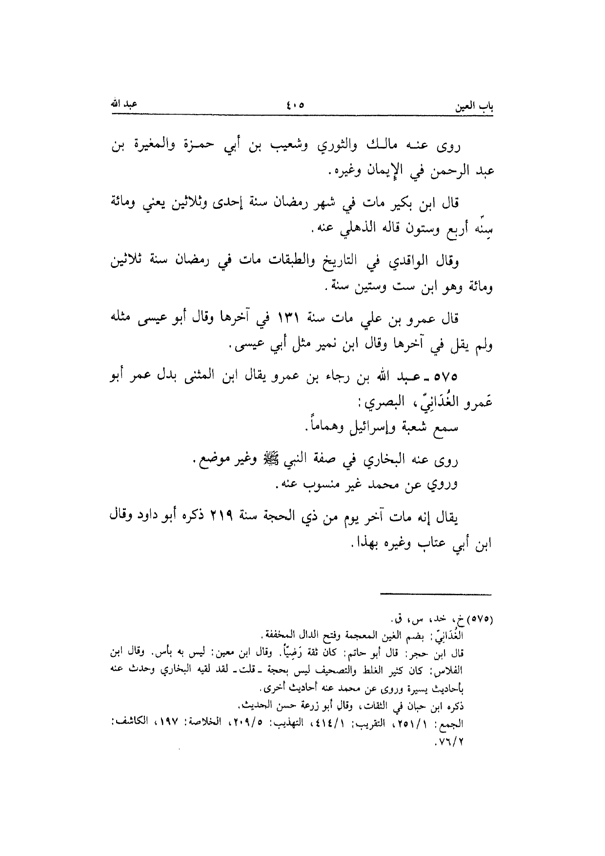 575 - عبد الله بن رَجَاء بن عَمْرو يُقَال ابْن الْمثنى بدل عمر أَبُو عَمْرو الغداني الْبَصْرِيّ سمع شُعْبَة وَإِسْرَائِيل وهماما رَوَى عَنهُ البُخَارِيّ فِي صفة النَّبِي صَلَّى الله عَلَيْهِ وَسلم وَغير مَوضِع وَرَوَى عَن مُحَمَّد غير مَنْسُوب عَنهُ يُقَال إِنَّه مَاتَ آخر يَوْم من ذِي الْحجَّة سنة 219 ذكره أَبُو دَاوُد وَقَالَ ابْن أبي عتاب وَغَيره بِهَذَا