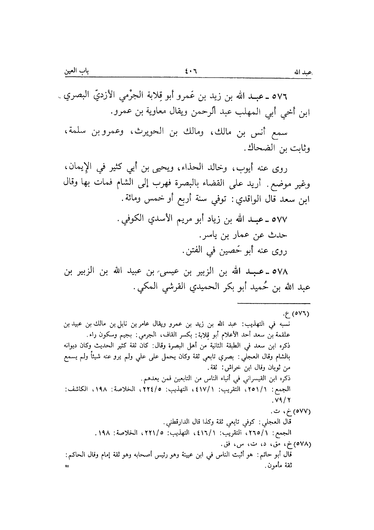 576 - عبد الله بن زيد بن عَمْرو أَبُو قلَابَة الْجرْمِي الْأَزْدِيّ الْبَصْرِيّ ابْن أخي أبي الْمُهلب عبد الرَّحْمَن وَيُقَال مُعَاوِيَة بن عَمْرو سمع أنس بن مَالك وَمَالك بن الْحُوَيْرِث وَعَمْرو بن سَلمَة وثابت بن الضَّحَّاك رَوَى عَنهُ أَيُّوب وخَالِد الْحذاء وَيَحْيَى بن أبي كثير فِي الْإِيمَان وَغير مَوضِع أُرِيد عَلَى الْقَضَاء بِالْبَصْرَةِ فهرب إِلَى الشَّام فَمَاتَ بهَا وَقَالَ ابْن سعد قَالَ الْوَاقِدِيّ توفّي سنة أَربع أَو خمس وَمِائَة
