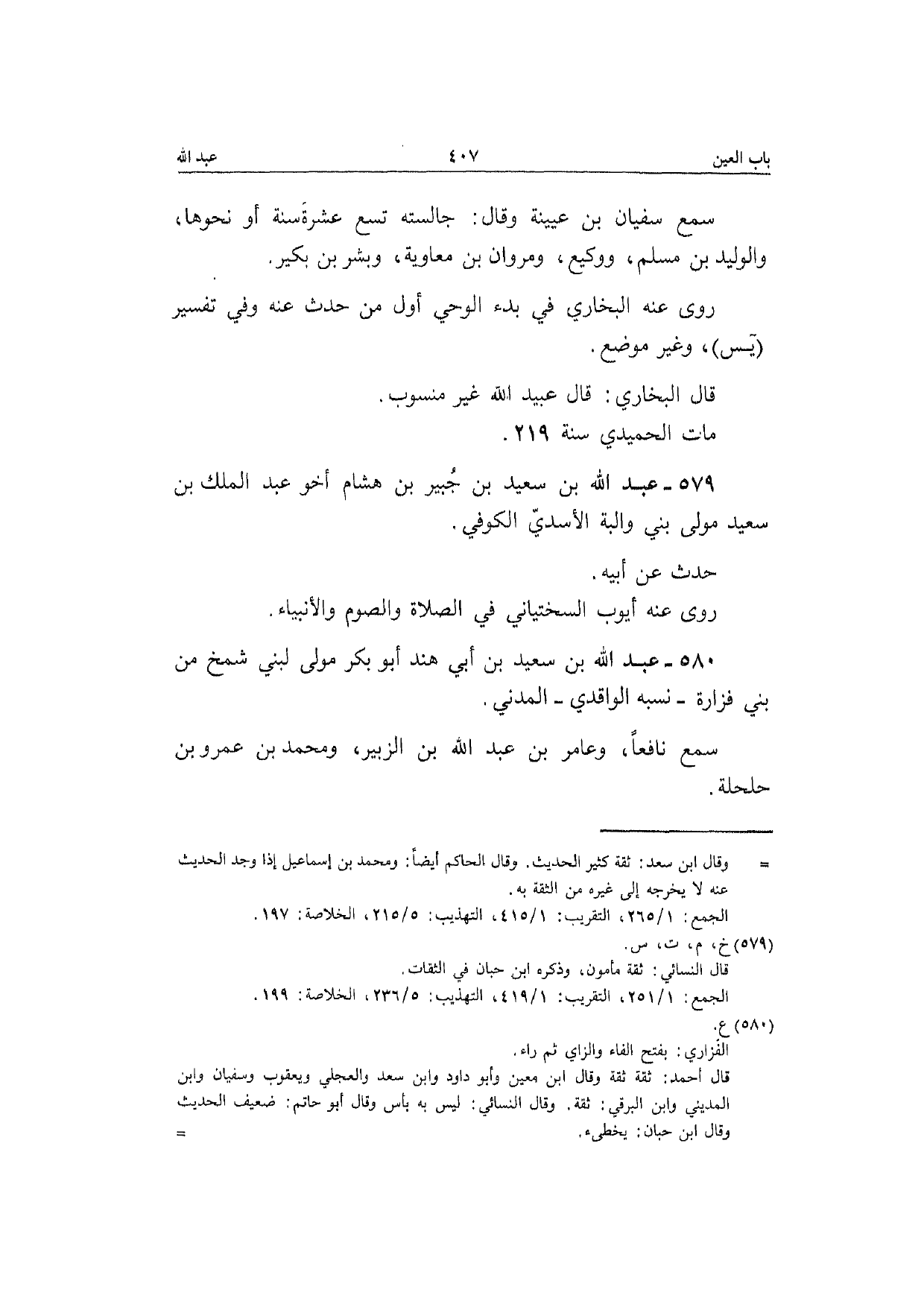 579 - عبد الله بن سعيد بن جُبَير بن هِشَام أَخُو عبد الْملك بن سعيد مولَى بني والبة الْأَسدي الْكُوفِي حدث عَن أَبِيه رَوَى عَنهُ أَيُّوب السّخْتِيَانِيّ فِي الصَّلَاة وَالصَّوْم والأنبياء
