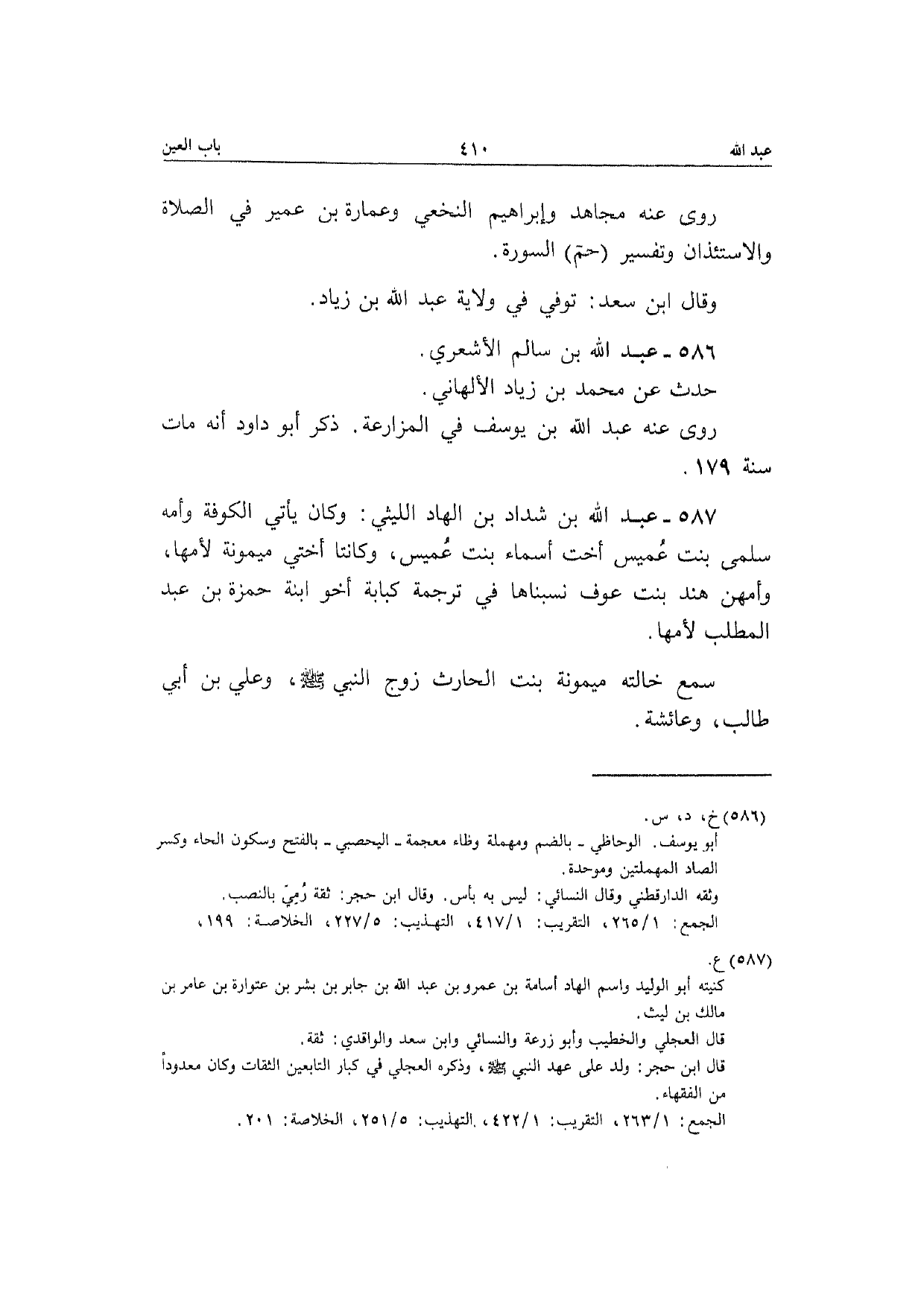 587 - عبد الله بن شَدَّاد بن الْهَاد اللَّيْثِيّ وَكَانَ يَأْتِي الْكُوفَة وَأمه سلمي بنت عُمَيْس أُخْت أَسمَاء بنت عُمَيْس وكانتا أُخْتِي مَيْمُونَة لأمها وأمهن هِنْد بنت عَوْف نسبناها فِي تَرْجَمَة كبابة أَخُو ابْنة حَمْزَة بن عبد الْمطلب لأمها سمع خَالَته مَيْمُونَة بنت الْحَارِث زوج النَّبِي صَلَّى الله عَلَيْهِ وَسلم وَعلي بن أبي طَالب وَعَائِشَة