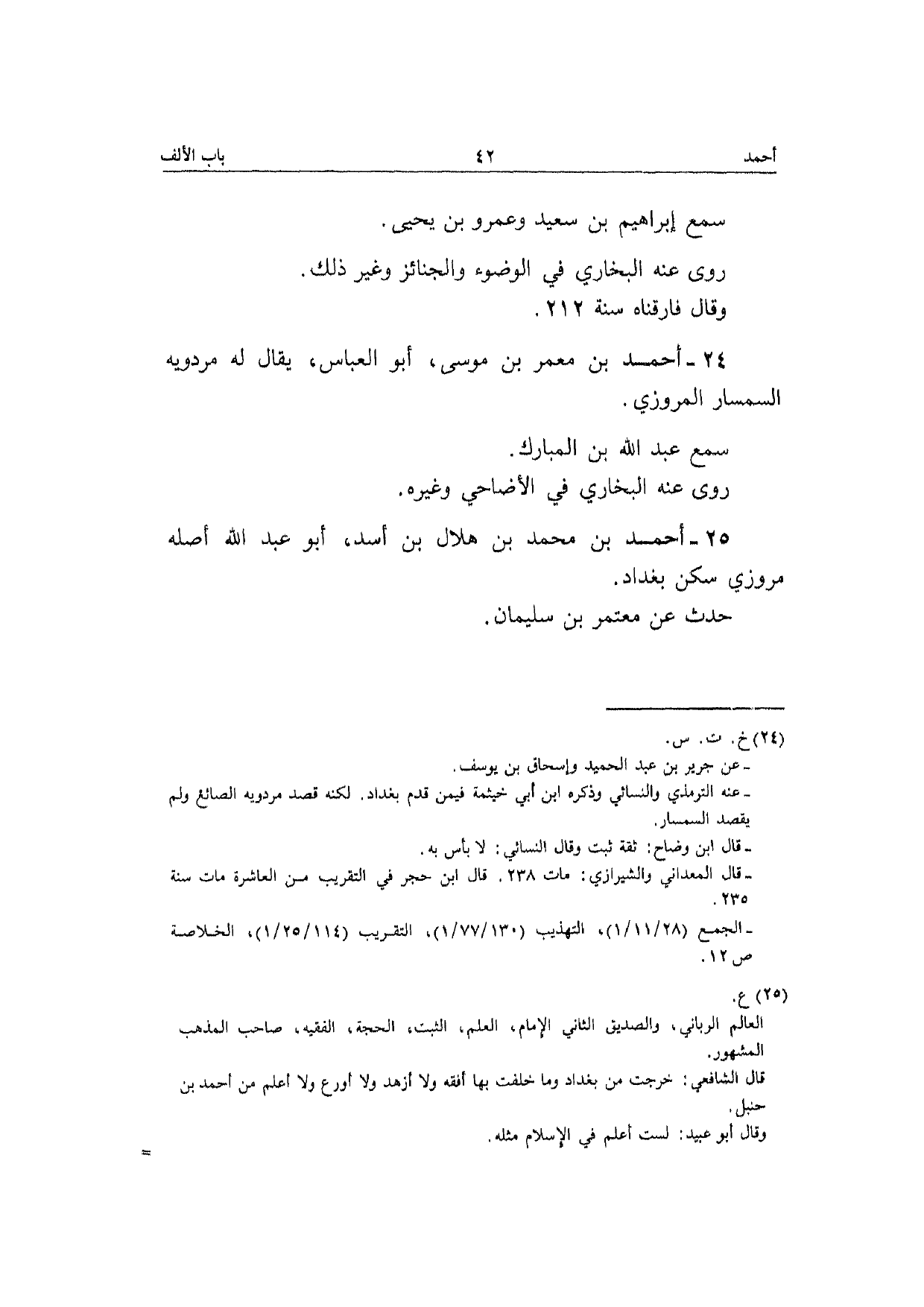 25 - أَحْمد بن مُحَمَّد بن هِلَال بن أَسد أَبُو عبد الله أَصله مروزي سكن بَغْدَاد حدث عَن مُعْتَمر بن سُلَيْمَان
