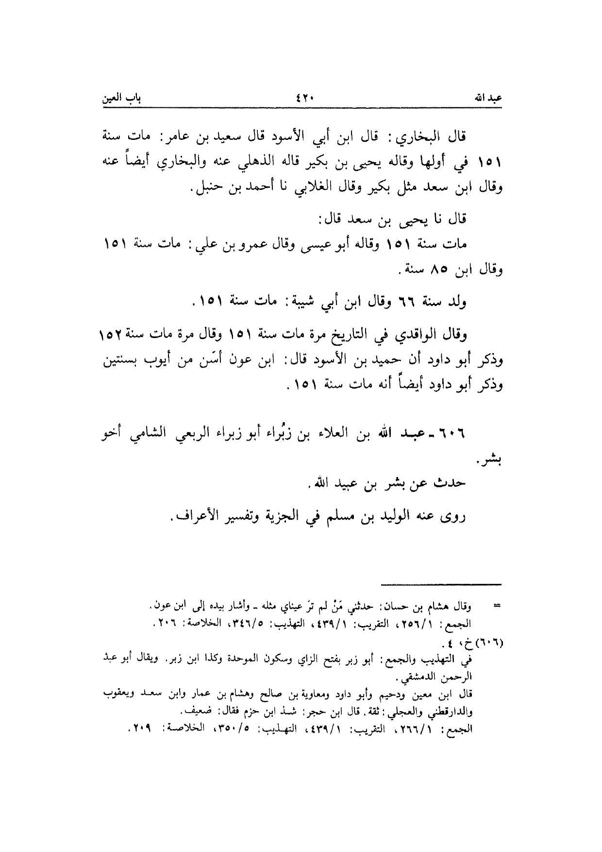 606 - عبد الله بن الْعَلَاء بن زبراء أَبُو زبراء الربعِي الشَّامي أَخُو بشر حدث عَن بشر بن عبيد الله رَوَى عَنهُ الْوَلِيد بن مُسلم فِي الْجِزْيَة وَتَفْسِير الْأَعْرَاف