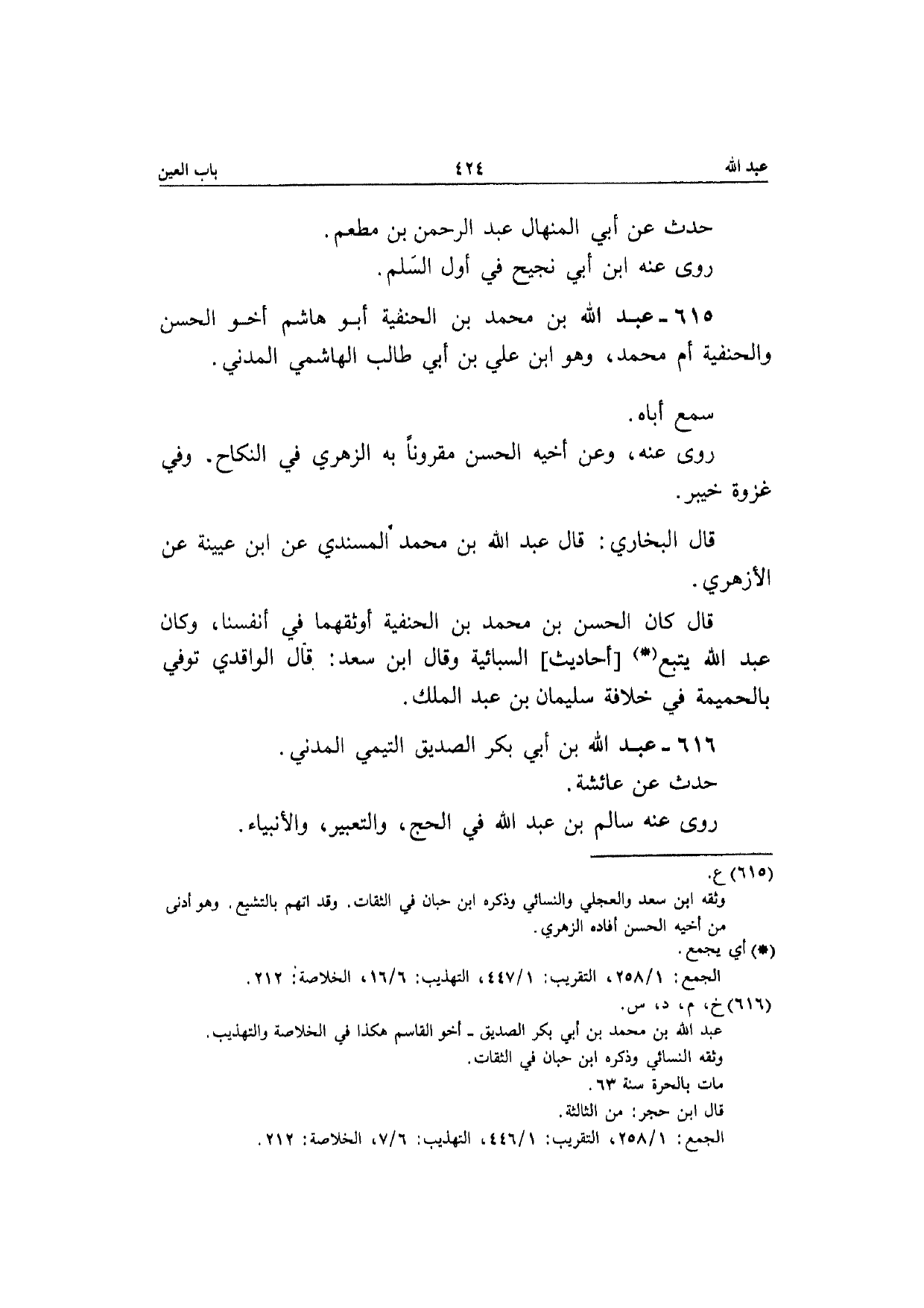 615 - عبد الله بن مُحَمَّد بن الْحَنَفِيَّة أَبُو هَاشم أَخُو الْحسن وَالْحَنَفِيَّة أم مُحَمَّد وَهُوَ ابْن عَلّي بن أبي طَالب الْهَاشِمِي الْمدنِي سمع أَبَاهُ رَوَى عَنهُ وَعَن أَخِيه الْحسن مَقْرُونا بِهِ الزُّهْرِيّ فِي النِّكَاح وَفِي غَزْوَة خَيْبَر قَالَ البُخَارِيّ قَالَ عبد الله بن مُحَمَّد المسندي عَن ابْن عُيَيْنَة عَن الْأَزْهَرِي قَالَ كَانَ الْحسن بن مُحَمَّد بن الْحَنَفِيَّة أوثقهما فِي أَنْفُسنَا وَكَانَ عبد الله يتبع [أَحَادِيث] السبائية وَقَالَ ابْن سعد قَالَ الْوَاقِدِيّ توفّي بالحميمة فِي خلَافَة سُلَيْمَان بن عبد الْملك