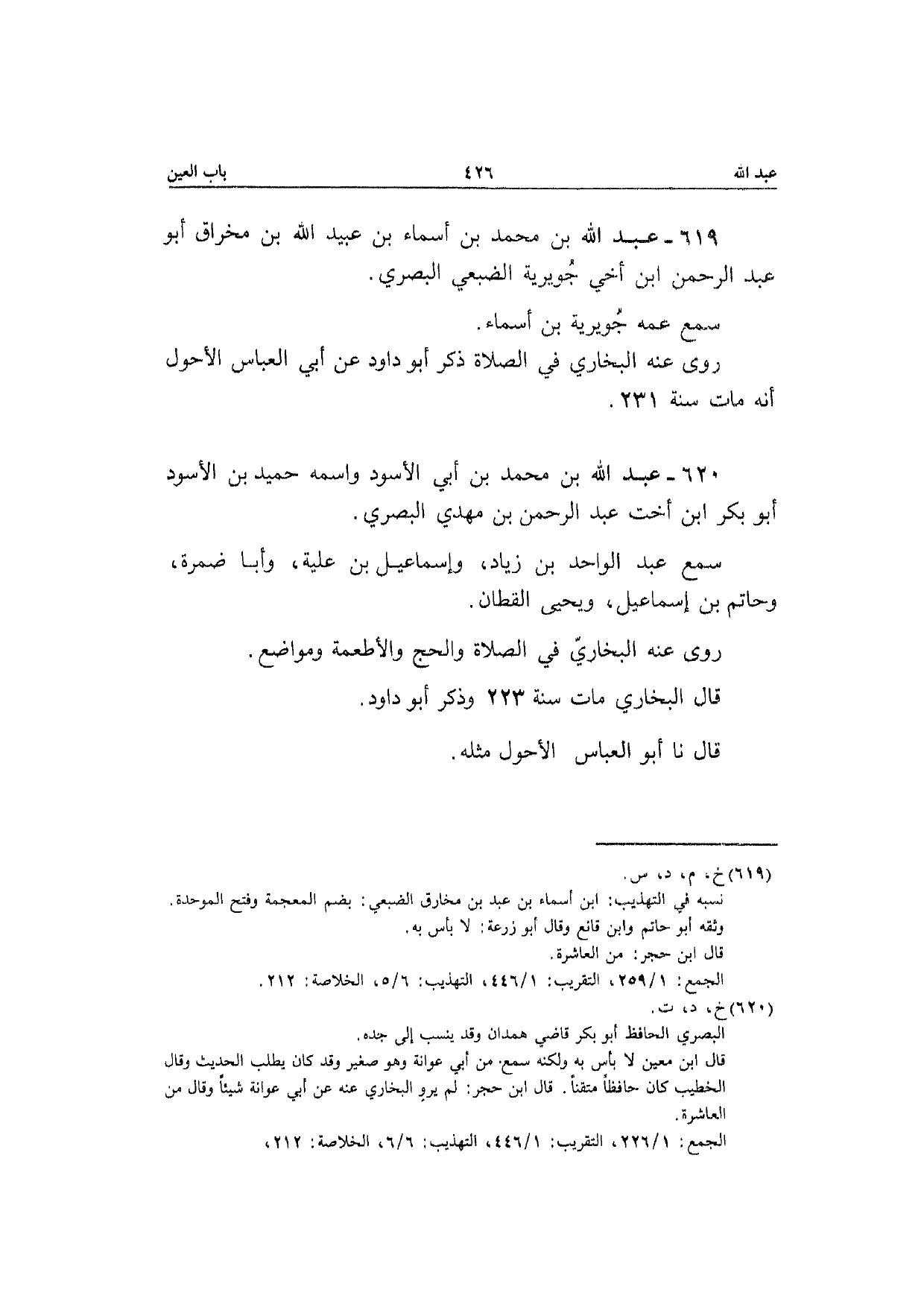 619 - عبد الله بن مُحَمَّد بن أَسمَاء بن عبيد الله بن مِخْرَاق أَبُو عبد الرَّحْمَن ابْن أخي جوَيْرِية الضبعِي الْبَصْرِيّ سمع عَمه جوَيْرِية بن أَسمَاء رَوَى عَنهُ البُخَارِيّ فِي الصَّلَاة ذكر أَبُو دَاوُد عَن أبي الْعَبَّاس الْأَحول أَنه مَاتَ سنة 231