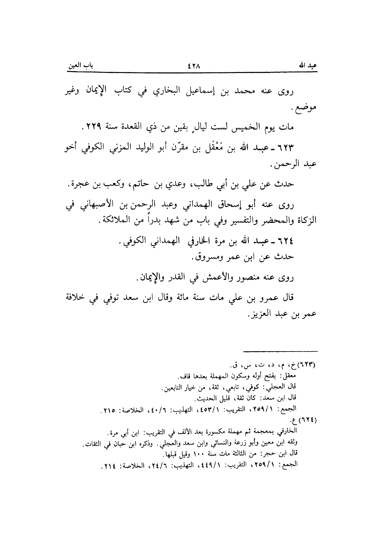 623 - عبد الله بن معقل بن مقرن أَبُو الْوَلِيد الْمُزنِيّ الْكُوفِي أَخُو عبد الرَّحْمَن حدث عَن عَلّي بن أبي طَالب وعدي بن حَاتِم وَكَعب بن عجْرَة رَوَى عَنهُ أَبُو إِسْحَاق الْهَمدَانِي وَعبد الرَّحْمَن بن الْأَصْبَهَانِيّ فِي الزَّكَاة والمحضر وَالتَّفْسِير وَفِي بَاب من شهد بَدْرًا من الْمَلَائِكَة
