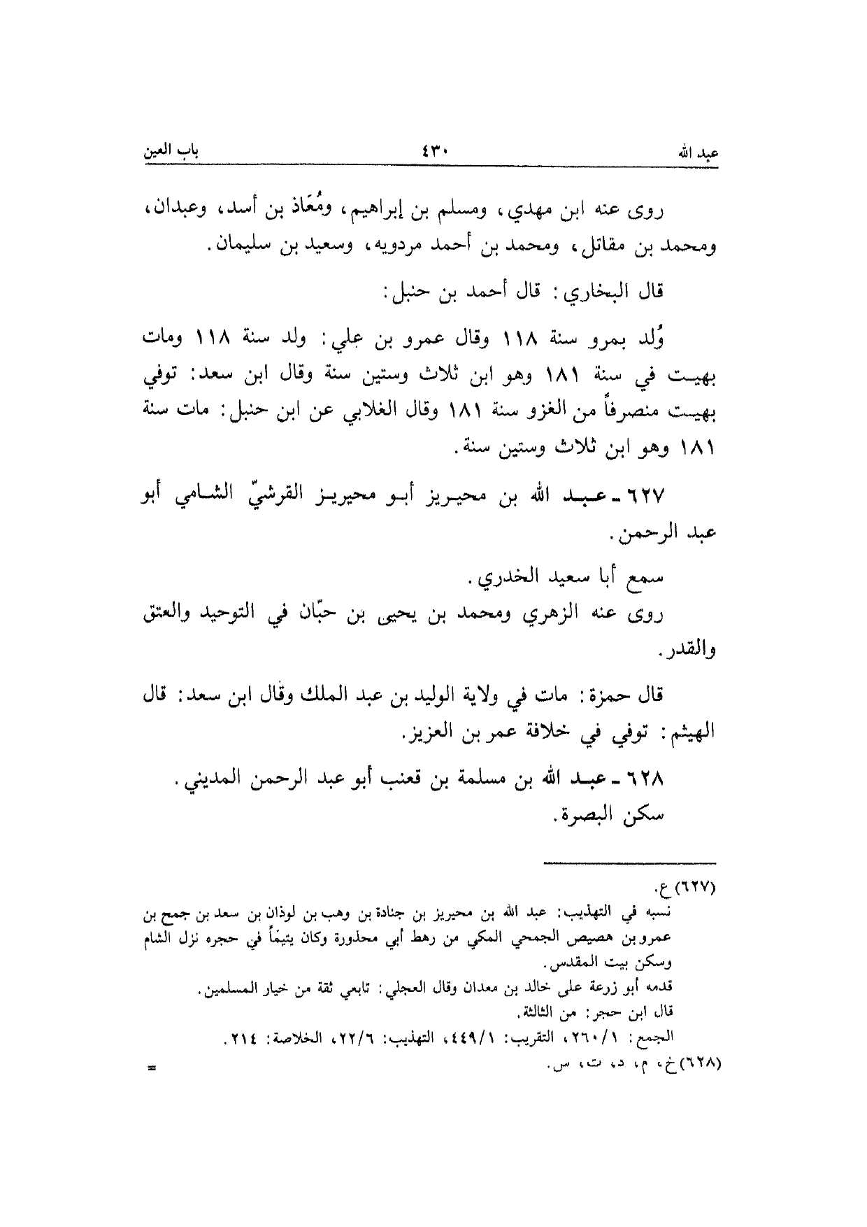 627 - عبد الله بن محيريز أَبُو محيريز الْقرشِي الشَّامي أَبُو عبد الرَّحْمَن سمع أَبَا سعيد الْخُدْرِيّ رَوَى عَنهُ الزُّهْرِيّ وَمُحَمّد بن يَحْيَى بن حبَان فِي التَّوْحِيد وَالْعِتْق وَالْقدر قَالَ حَمْزَة مَاتَ فِي ولَايَة الْوَلِيد بن عبد الْملك وَقَالَ ابْن سعد قَالَ الْهَيْثَم توفّي فِي خلَافَة عمر بن الْعَزِيز