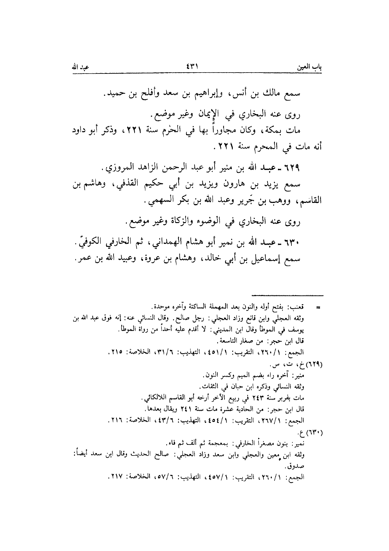 630 - عبد الله بن نمير أَبُو هِشَام الْهَمدَانِي ثمَّ الخارفي الْكُوفِي سمع إِسْمَاعِيل بن أبي خَالِد وَهِشَام بن عُرْوَة وَعبيد الله بن عمر