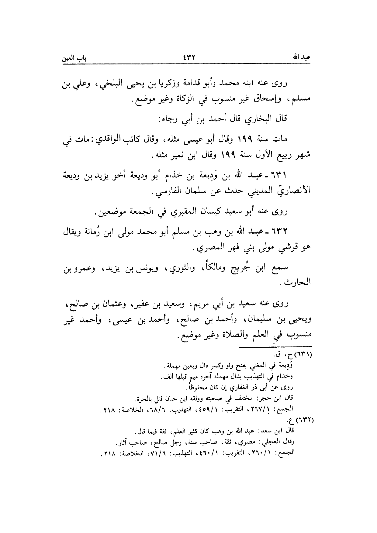 632 - عبد الله بن وهب بن مُسلم أَبُو مُحَمَّد مولَى ابْن رمانة وَيُقَال هُوَ قرشي مولَى بني فهر الْمصْرِيّ سمع ابْن جريج ومالكا وَالثَّوْري وَيُونُس بن يزِيد وَعَمْرو بن الْحَارِث رَوَى عَنهُ سعيد بن أبي مَرْيَم وَسَعِيد بن عفير وَعُثْمَان بن صَالح وَيَحْيَى بن سُلَيْمَان وَأحمد بن صَالح وَأحمد بن عِيسَى وَأحمد غير مَنْسُوب فِي الْعلم وَالصَّلَاة وَغير مَوضِع