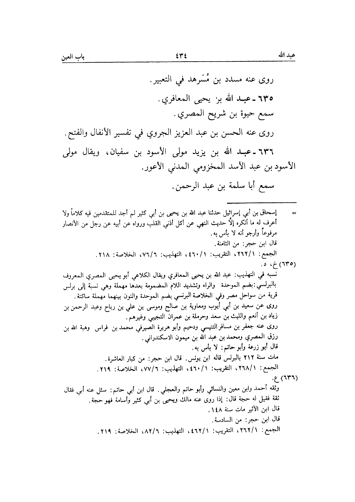 635 - عبد الله بن يَحْيَى الْمعَافِرِي سمع حَيْوَة بن شُرَيْح الْمصْرِيّ رَوَى عَنهُ الْحسن بن عبد الْعَزِيز الجروي فِي تَفْسِير الْأَنْفَال وَالْفَتْح