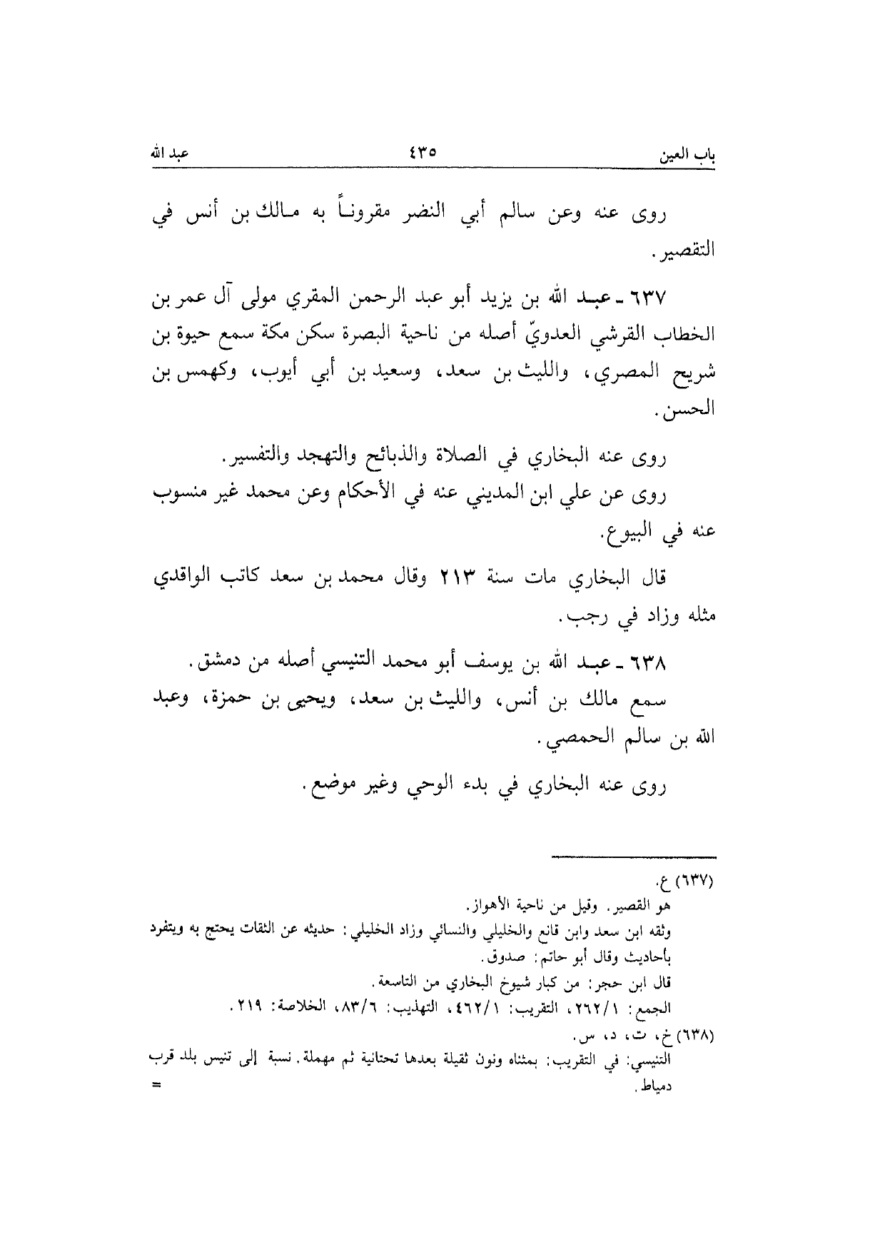 638 - عبد الله بن يُوسُف أَبُو مُحَمَّد التنيسِي أَصله من دمشق سمع مَالك بن أنس وَاللَّيْث بن سعد وَيَحْيَى بن حَمْزَة وَعبد الله بن سَالم الْحِمصِي رَوَى عَنهُ البُخَارِيّ فِي بَدْء الْوَحْي وَغير مَوضِع