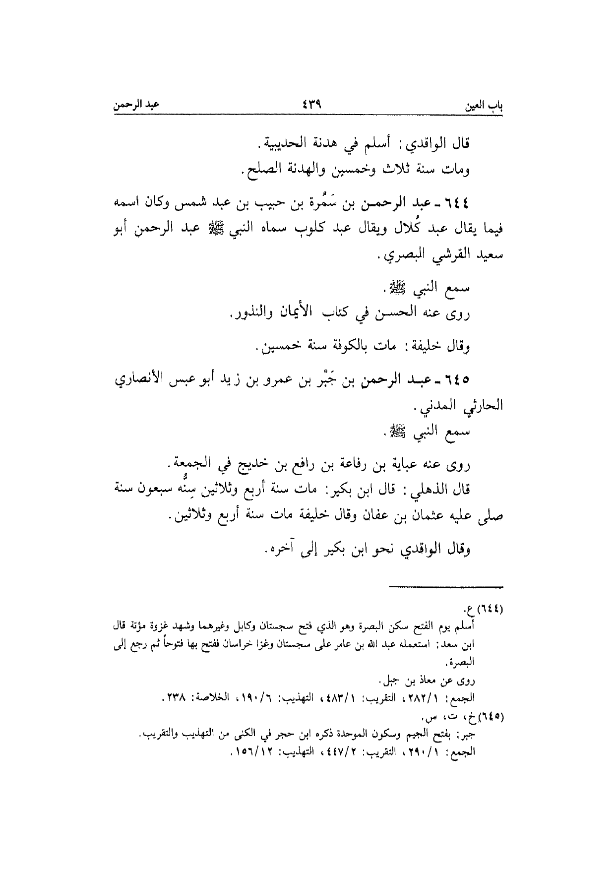 644 - عبد الرَّحْمَن بن سَمُرَة بن حبيب بن عبد شمس وَكَانَ اسْمه فِيمَا يُقَال عبد كلال وَيُقَال عبد كَلوب سَمَّاهُ النَّبِي صَلَّى الله عَلَيْهِ وَسلم عبد الرَّحْمَن أَبُو سعيد الْقرشِي الْبَصْرِيّ سمع النَّبِي صَلَّى الله عَلَيْهِ وَسلم رَوَى عَنهُ الْحسن فِي كتاب الْأَيْمَان وَالنُّذُور وَقَالَ خَليفَة مَاتَ بِالْكُوفَةِ سنة خمسين